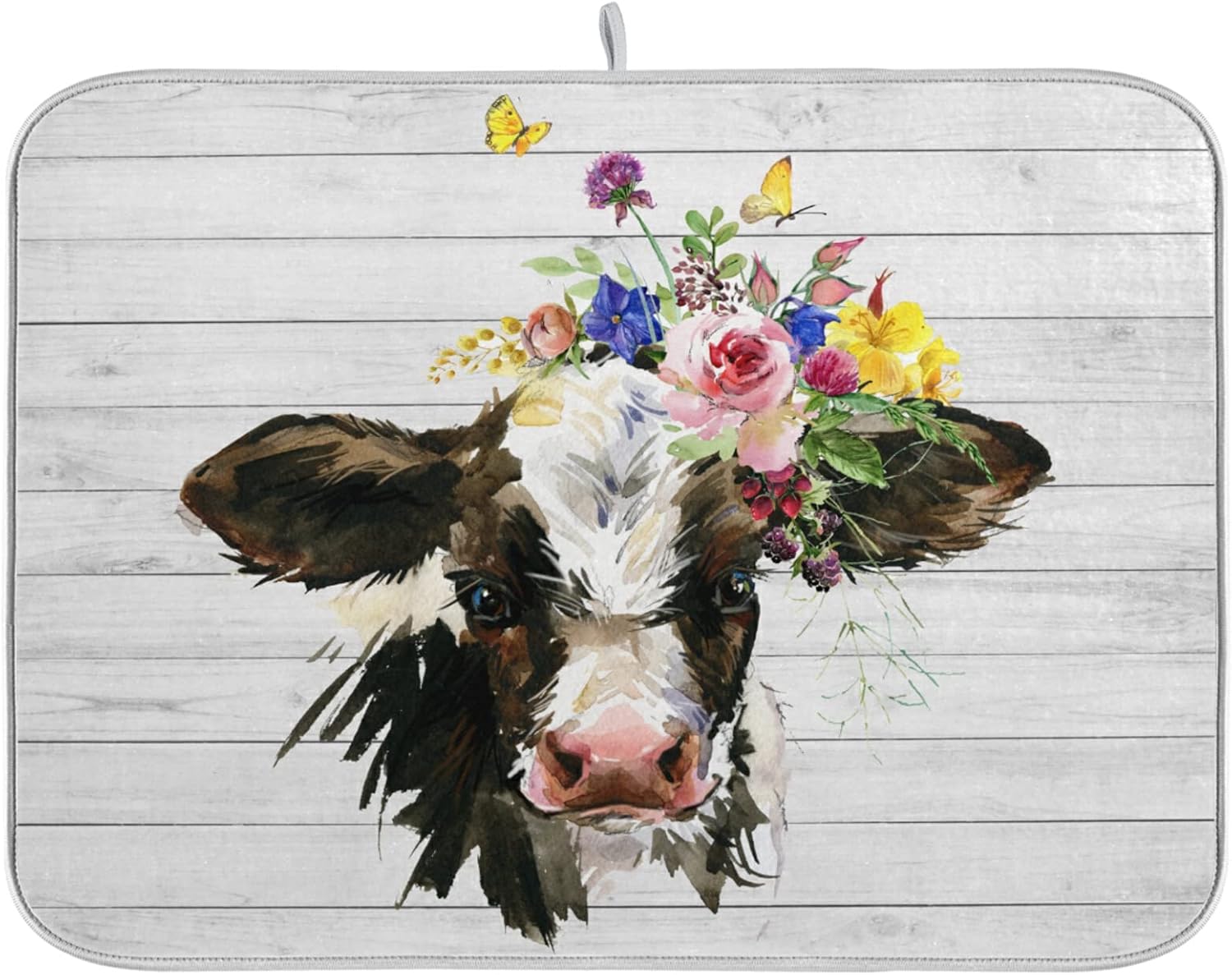 White Farmhouse Cow Wood Dish Drying Mats for Kitchen Drying Mat 16 x 18 Inch Absorbent Microfiber Drying Dish Mat Machine Washable Dish Rack Pad Dish Drainer Mat
