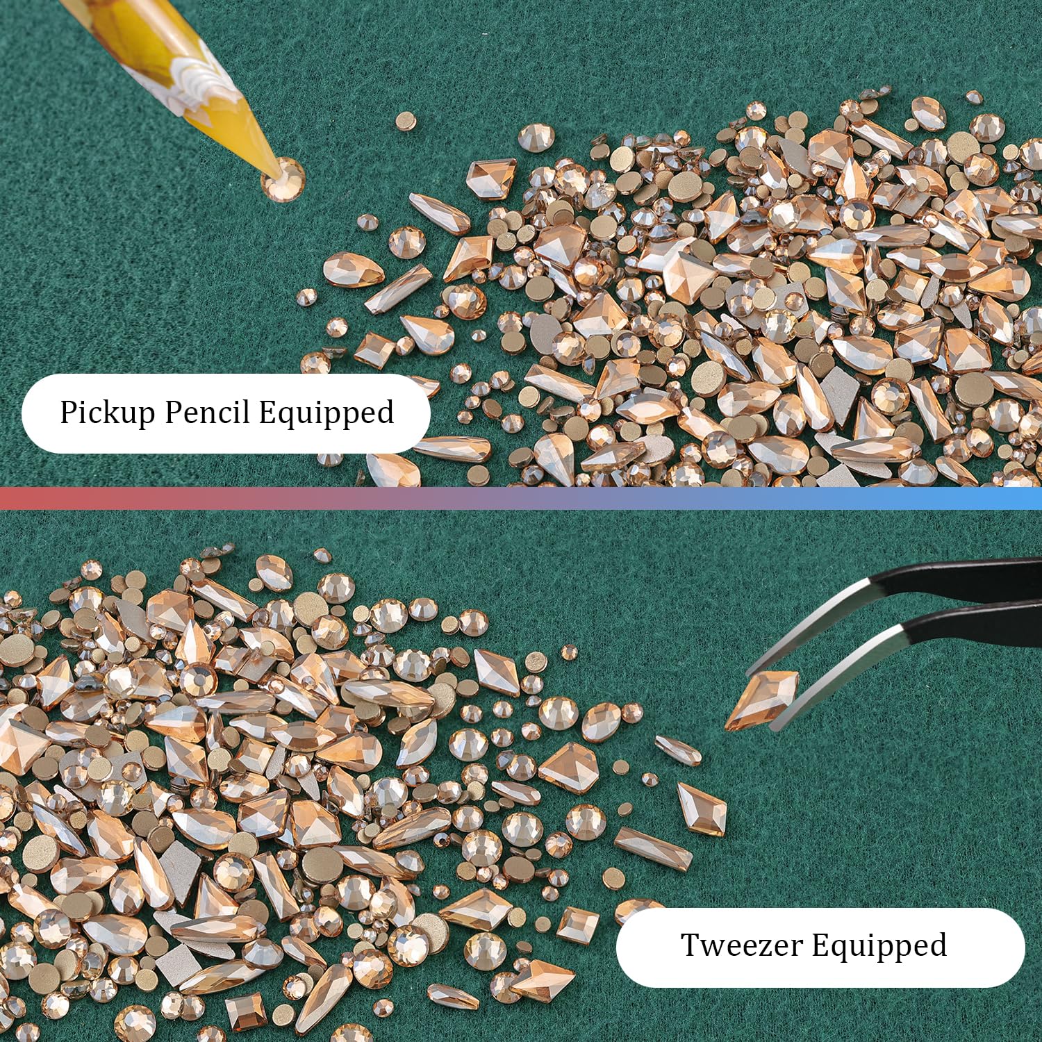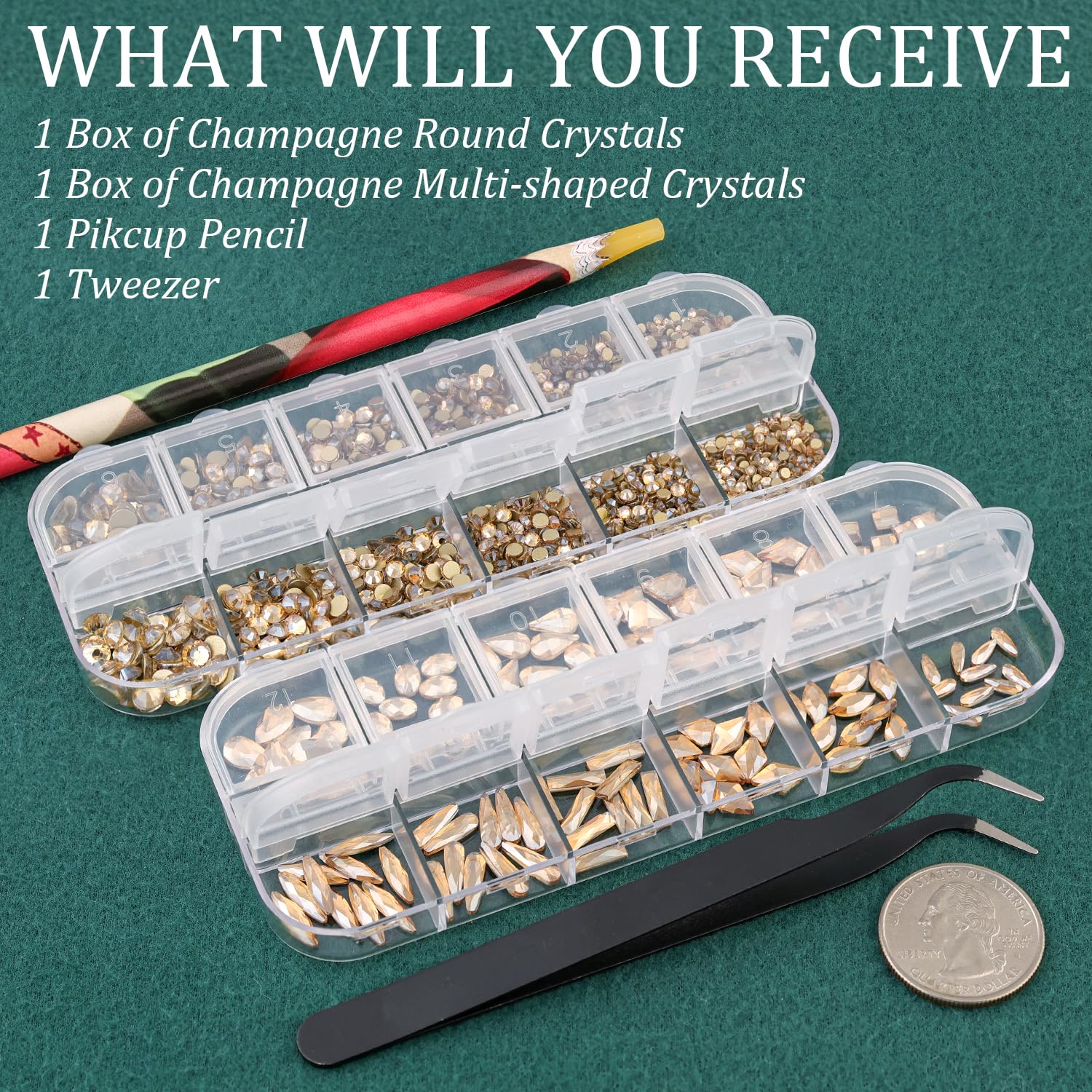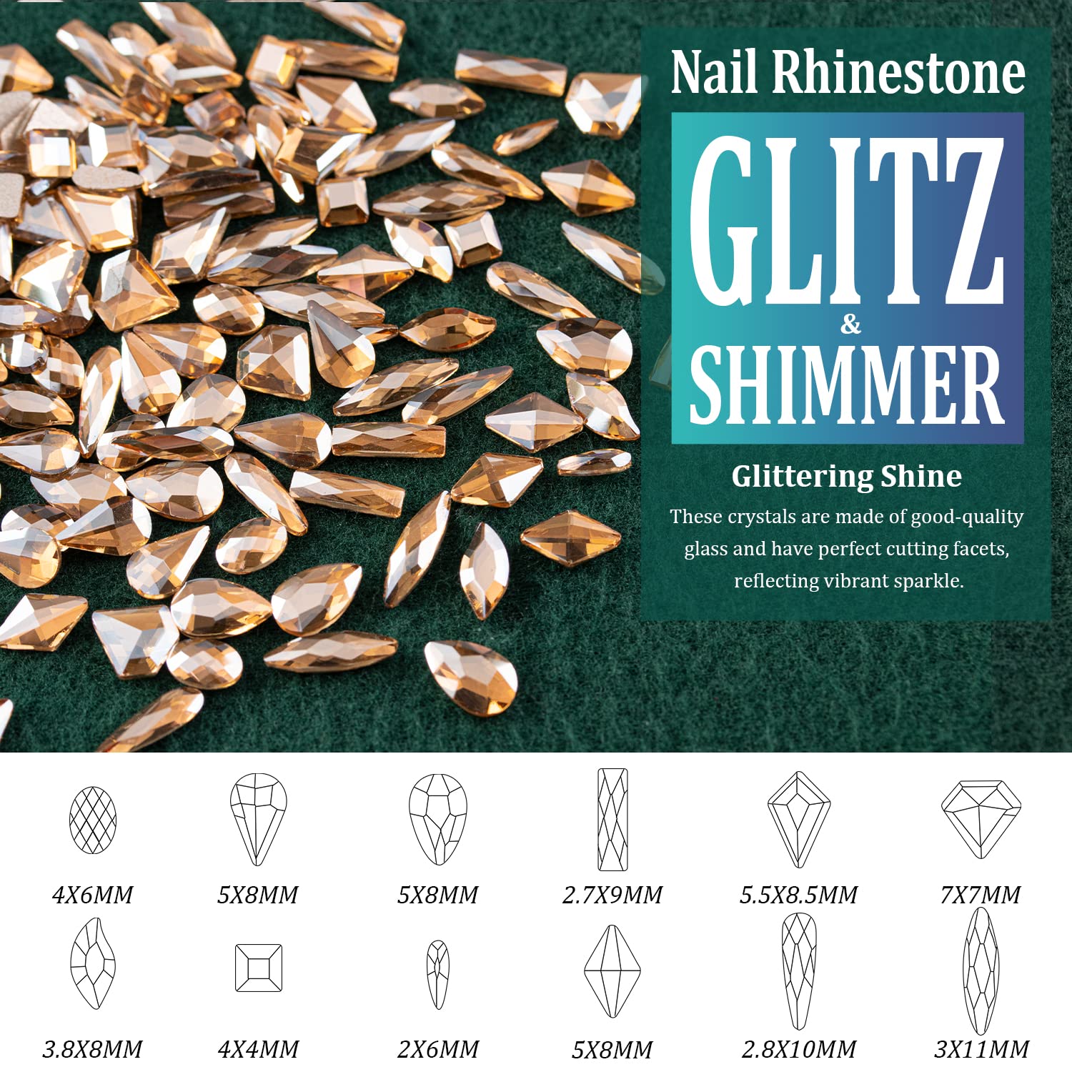 - ❤WHAT YOU WILL RECEIVE -- 1 Box of 6 Sizes Champagne Round Glass Nail Crystal Rhinestones Beads (Totally About 1720 PCS); 1 Box of 12 Different Shaped Styles Champagne Glass Stones Gem (About 120 PCS; 10 PCS for Each Shape); 1 PCS Rhinestone Picker Pencil; 1 PCS Tweezer. The Well Equipped Rhinestone Set Is Suitable for Both Professional Nail Technician and Inexperienced Starter for Nail Art.
