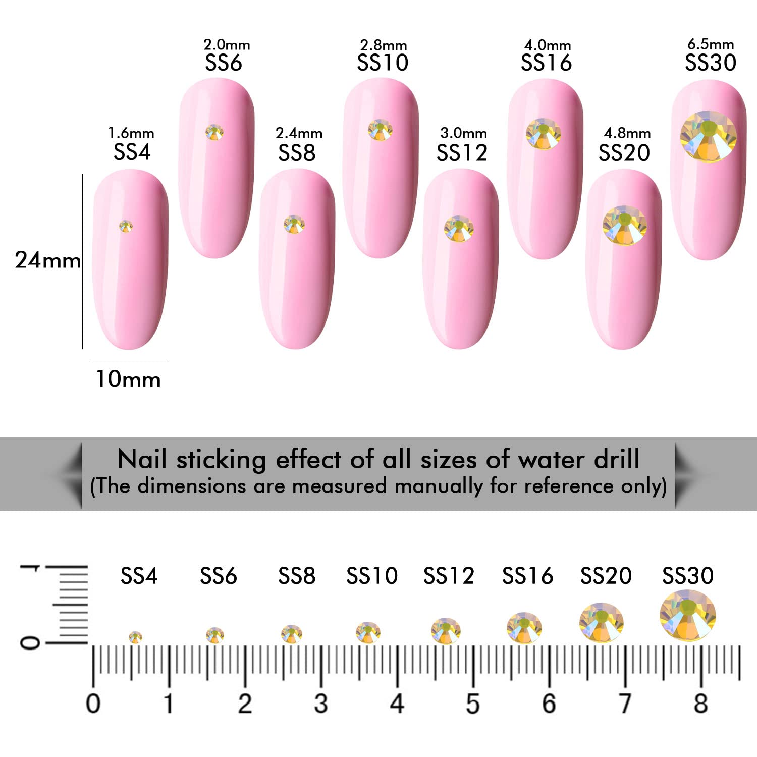 - Different Sizes Available:These rhinestones for crafts come in a wide range of sizes (1.6mm, 2mm, 2.4mm, 2.8mm, 3mm, 4mm, 4.8mm) to suit your different needs