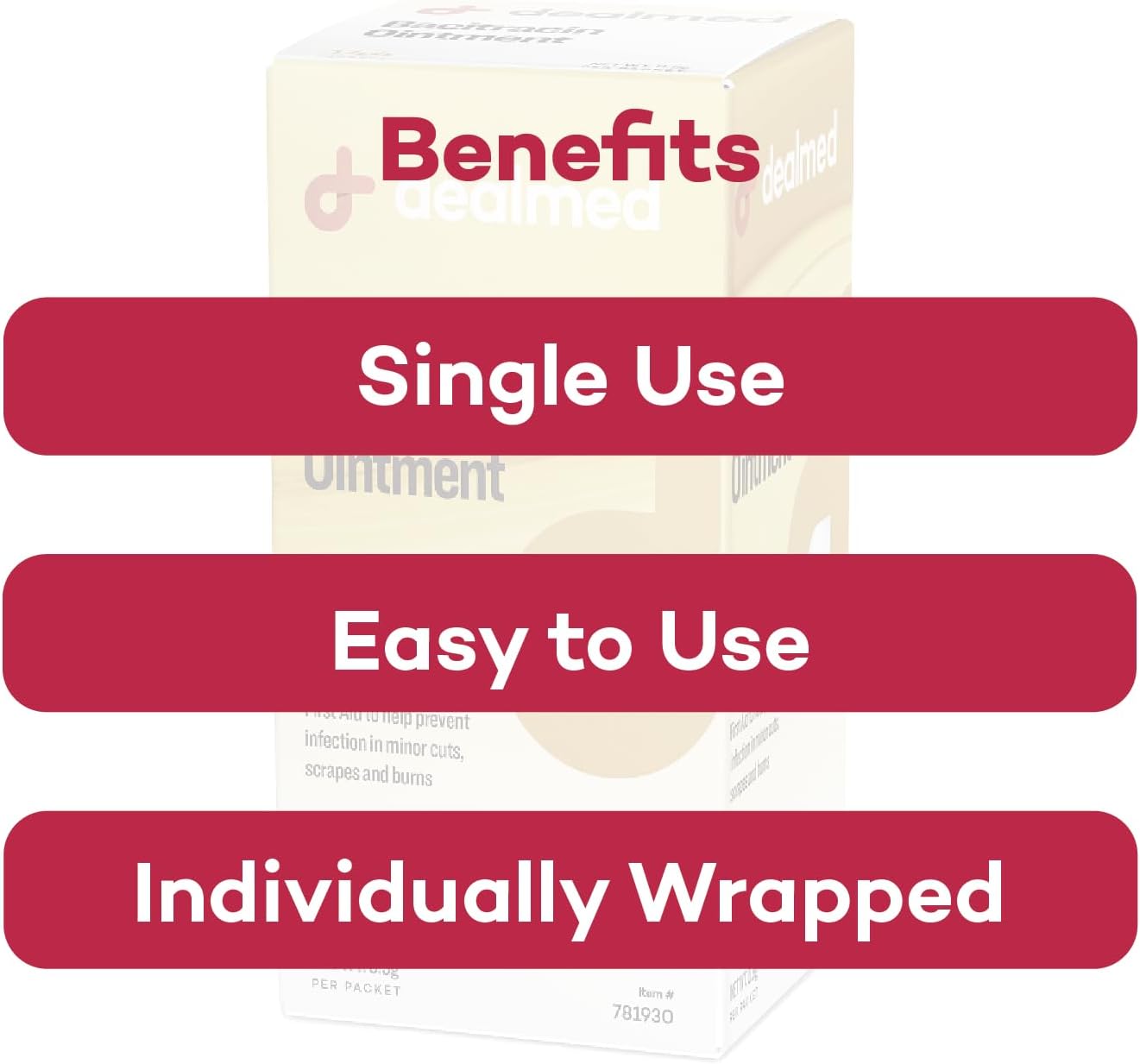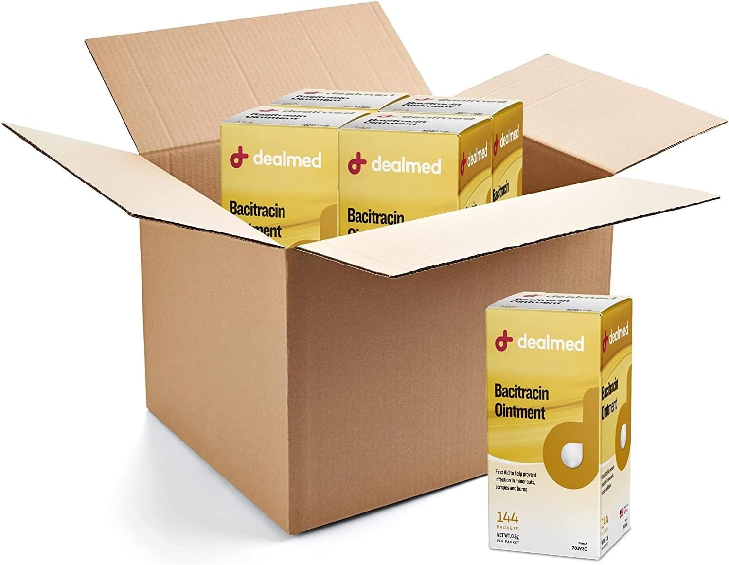 - Dealmed Bacitracin Antibiotic Ointment: Made in The USA - 0.9 gm UD, 144 Per Box, Single-Use Packets for First Aid Antibiotic Pain Relieving Ointment for Minor Cuts, Scrapes, and Burns. Great for schools, daycares, first aid kits, work offices, at home and more! (12 Boxes)