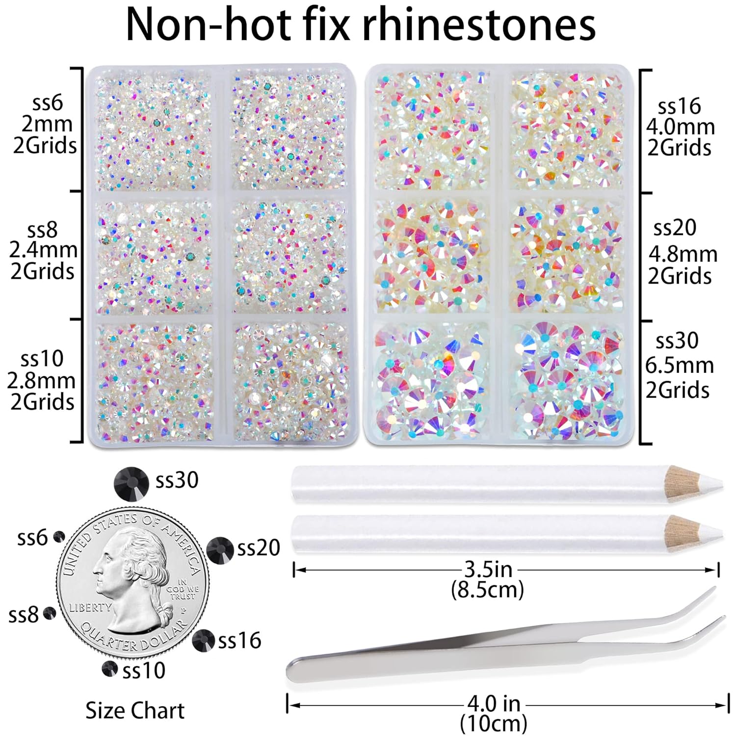 - 6 Sizes charming crystal rhinestones with storage boxes easy to carry, 1.5mm to 6mm. ss6 ss8 ss10 ss16 ss20 and ss30. Rhinestones are not hotfix and require glue to stick them, glue is not included.
