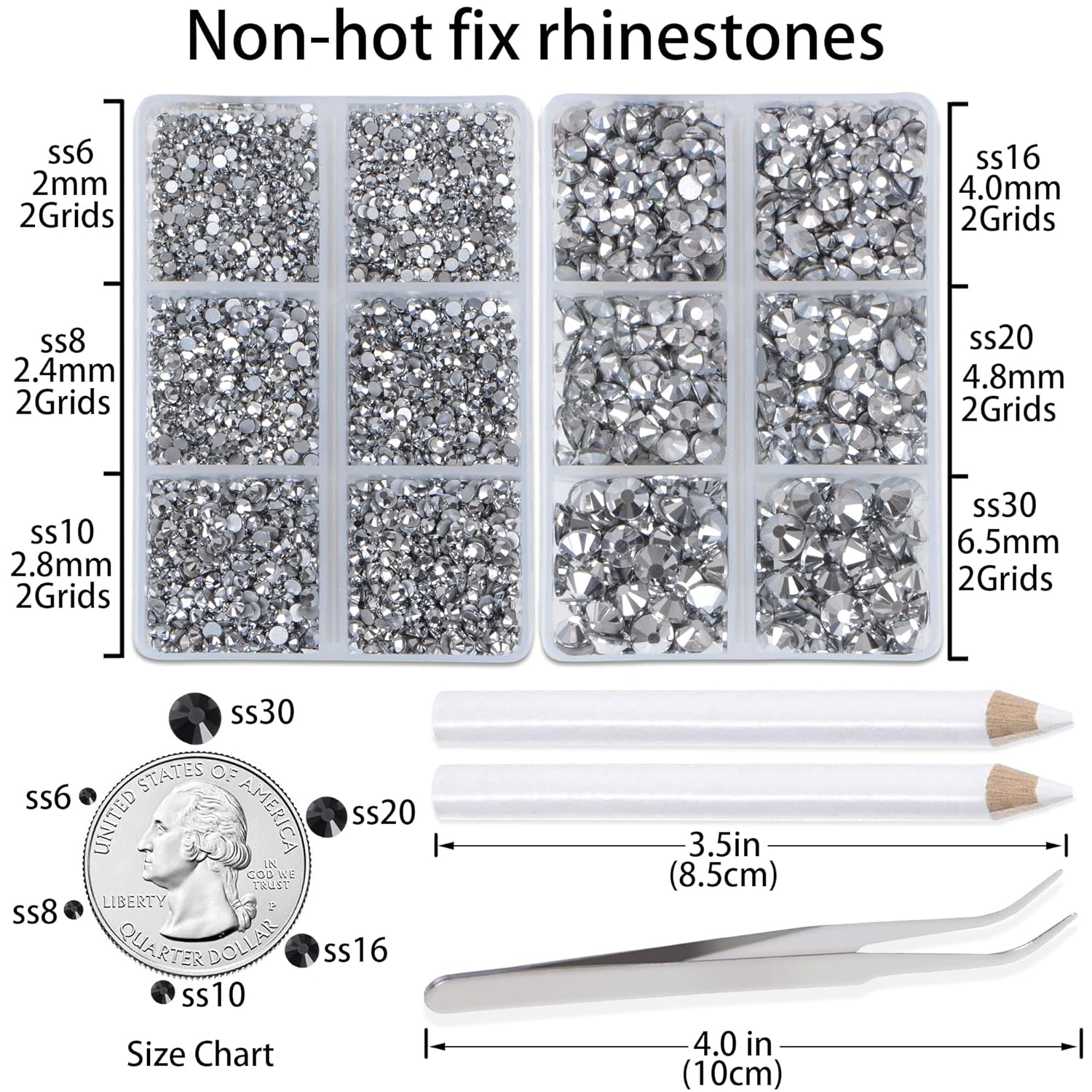 - 6 Sizes charming crystal rhinestones with storage boxes easy to carry, 1.5mm to 6mm. ss6 ss8 ss10 ss16 ss20 and ss30. Rhinestones are not hotfix and require glue to stick them, glue is not included.