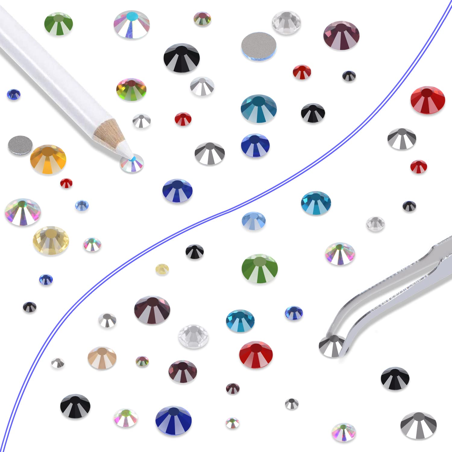 - Approx 6000 pcs of good quality sparkly flatback glass rhinestones with tweezers and 2 picker wax pencils help you easily pick up and set rhinestones in all your jewelry.
