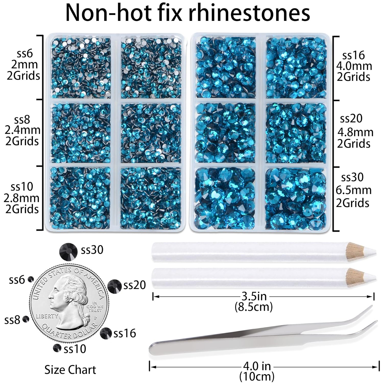 LPBeads 6000 Pieces Peacock Blue Zircon Non Hotfix Rhinestones 6 Sizes Round Crystal Glass Flat Back Rhinestones with Tweezers and Picking Pen for Nail Art Crafts Clothes Bags DIY
