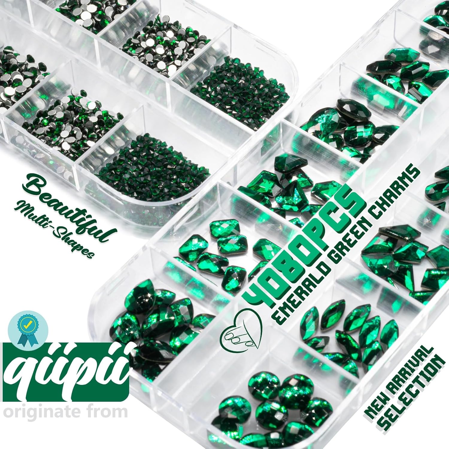 - ❤【2 Boxes 24 Grids Crystal Emerald Green Nail Rhinestones + Stainless Steel Tweezer + Pickup Pen】qiipii 4080Pcs sparkling crystal dark green rhinestones nail crystals. Including 12-shapes crystal rhinestones, multi-sized round crystal gem rhinestones. Enough amounts and more shape options for your daily work, go out or other decoration purposes. Comes with 1 Stainless Steel Tweezer and Pickup Pen for Manicure DIY Decoration at Home Salon Supplies.