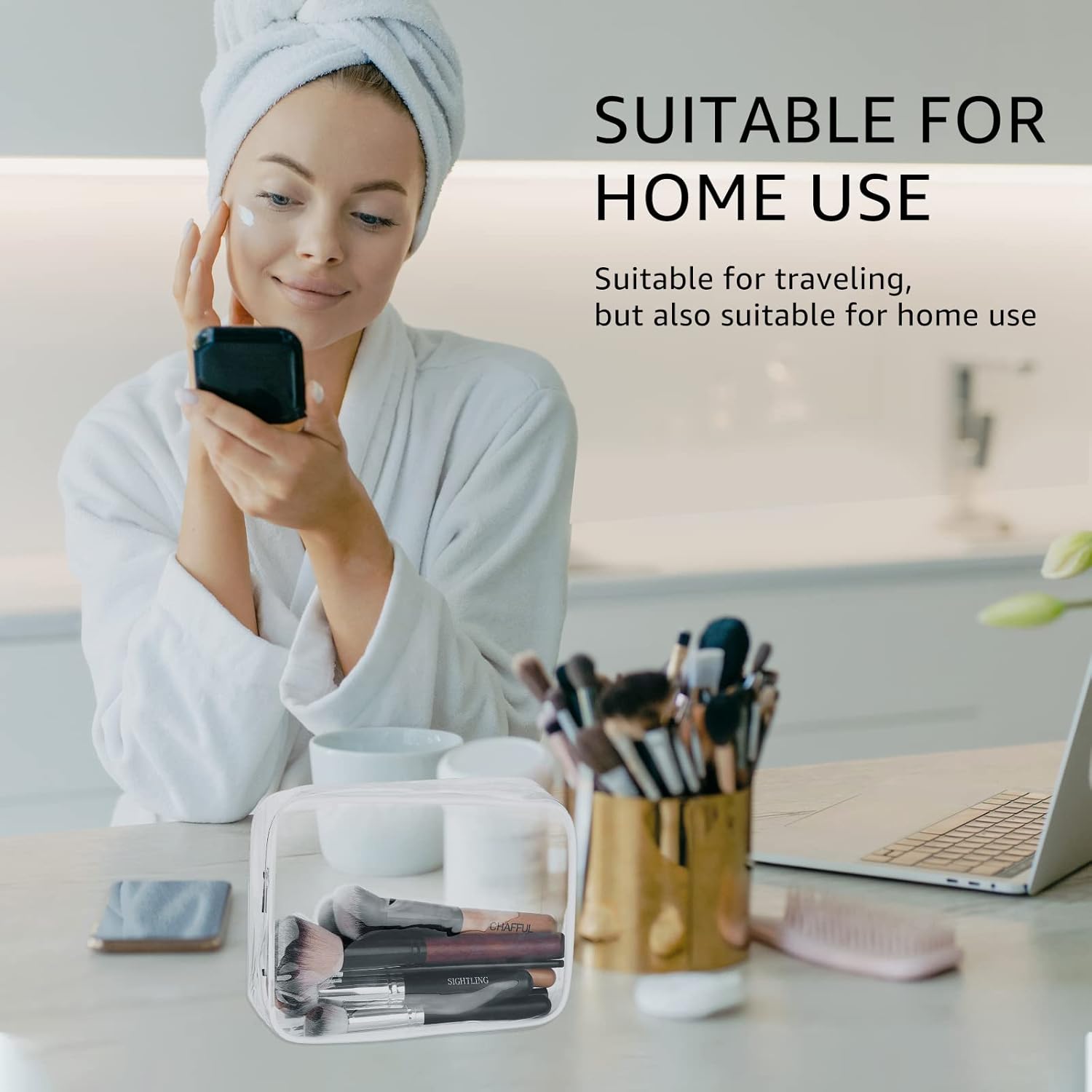 • Improved 0.6mm thickened transparent PVC material, softer and more pliable, durable and reusable; 3 PACKS 3 DIFFERENT SIZES: 1x Large clear toiletry bag (11.8" x 3.9" x 8.7"), 1x Medium clear makeup bag (9.5" x 1.9" x 7.9"), 1x Small clear cosmetic bag (7" x 1.6" x 5.5")