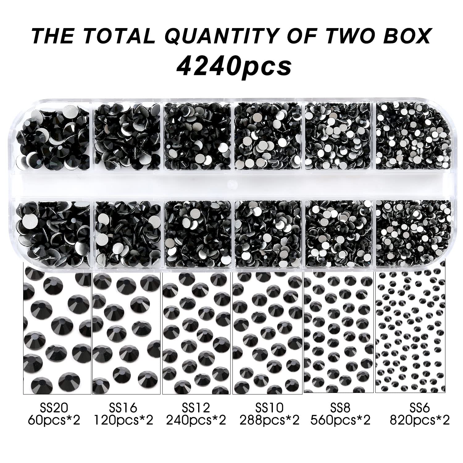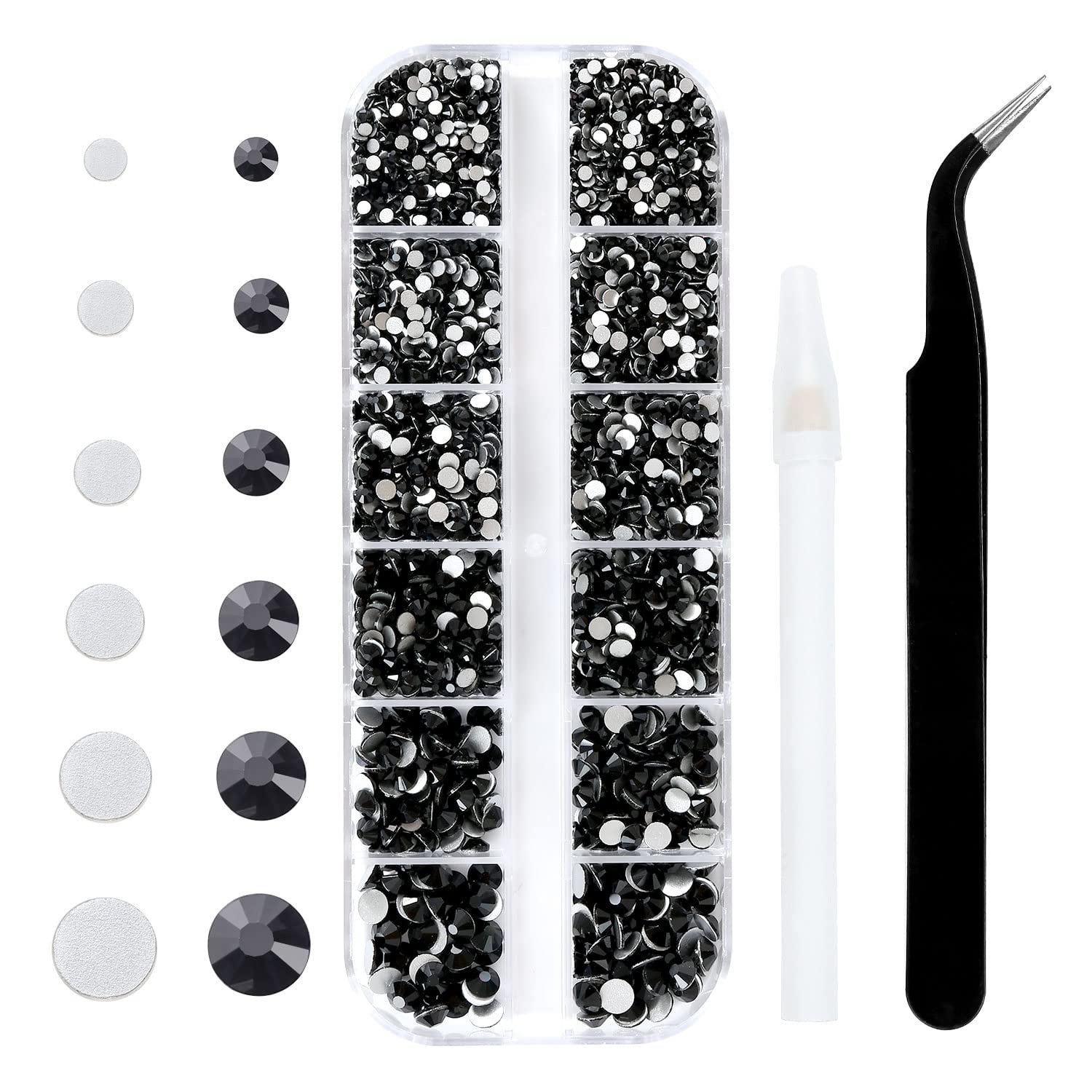 4240Pcs Flatback Black Rhinestones Glass Crystal Gemstones for Nail Art Eye Jewels Makeup Round with Tweezers and Picking Pen (SS6~SS20 Set)
