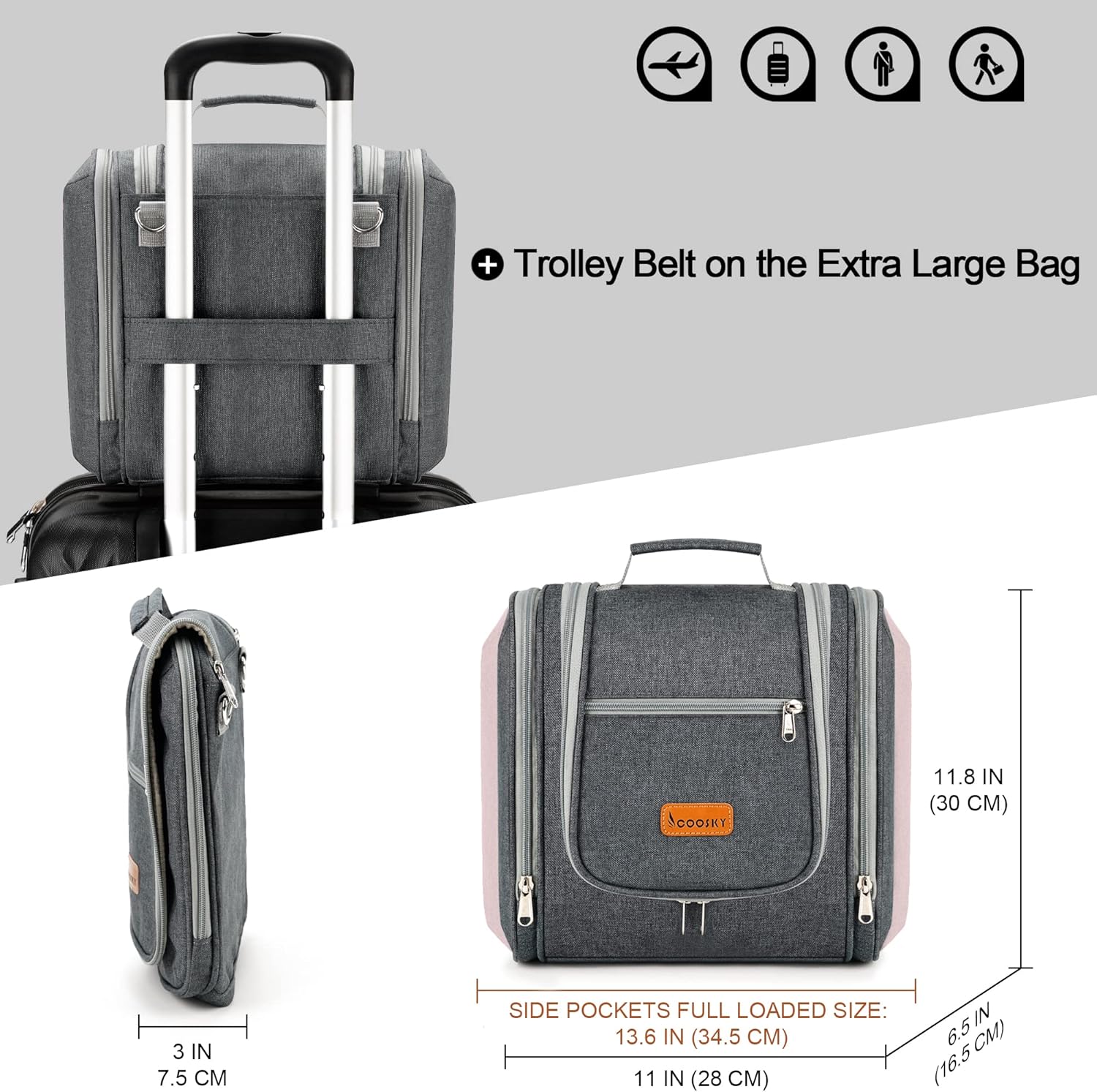 - GREAT ORGANIZER MASTER – This toiletry bag is designed with 6 storage compartments. You can categorize all your toiletries and put them into different pockets to make your journey orderly. Full load state size: 13.6 " L x 6.5" W x 11.8 " H, Empty state size:11" L x 6.5" W x 11.8" H. its main compartment can accommodate full-size toiletries and cosmetics (23.6oz / 700ml), travel essentials.