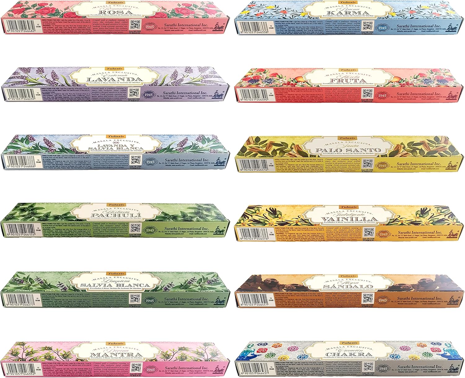 - SET INCLUDES: 180 incense sticks (12 x 15 Pc). This Tulasi Incense Stick Gift Pack includes 12 different fragrances boxes, each box contains 15 sticks | Romantic Rose, Lush Lavender, Lavender & White Sage, Herbal Patchouli, Cleansing White Sage, Divine Mantra, Good Karma, Mix Fruit, Holy Palo Santo, Indulgent Vanilla, Black Sandalwood, Healing Chakra
