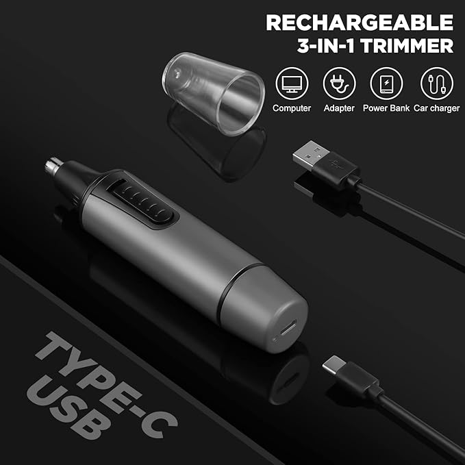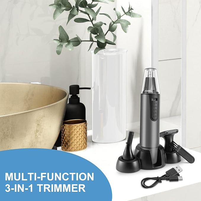 - 【MULTIFUNCTIONAL HAIR TRIMMER】This 3 in 1 versatile electric clippers includes 3 attachement blade: nose hair kit, ear hair, eyebrow trimmer blade, can be used as nasal hair trimmer, facial hair trimmer, beard trimmer, ear hair trimmer. It can effectively remove the unwanted hair from your head to toe, meeting your different needs in one multi-functional trimmer device.