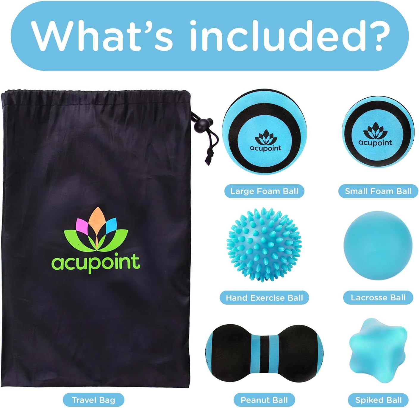 - COMPLETE MASSAGE BALL KIT: This set includes a trigger point peanut ball, a large foam ball, a spiked massage ball for feet, a lacrosse ball, a small foam ball, and a hand exercise ball. It comes with a convenient carry bag.