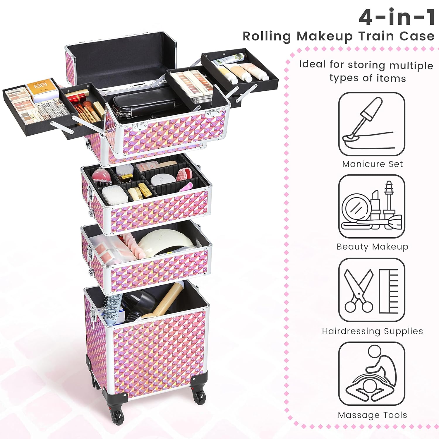 - Versatile For Makeup & Beauty Enthusiasts: This travel makeup case is a must-have for professional makeup artists, manicurists, hair stylists, and beauticians. It provides ample storage space, convenient organizing compartments, and easy portability. Whether you're on the move or working in a salon, this case has got you covered