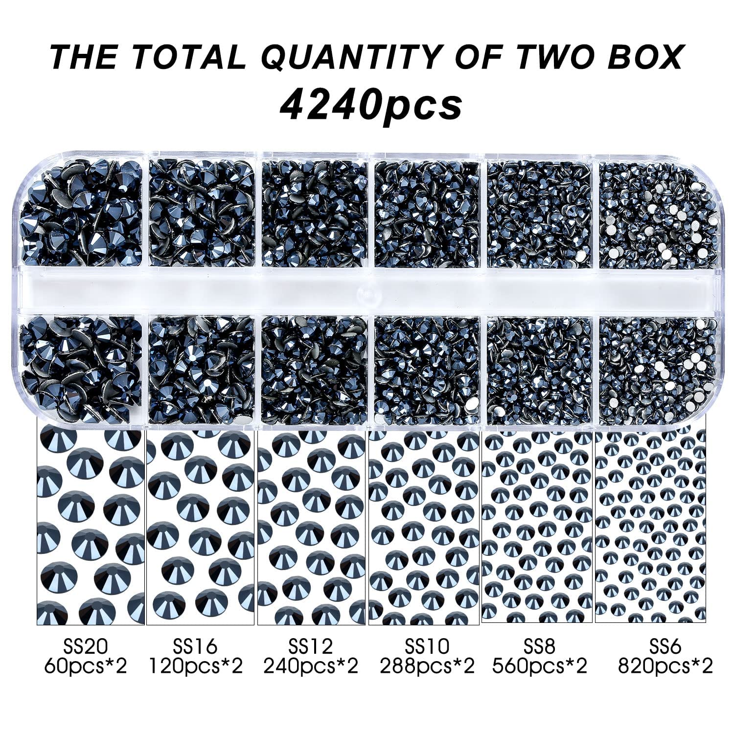 - 💎Product Packaging: Boxed SS6 2MM - 1680 Pcs, SS8 2.4MM - 1120 Pcs, SS10 2.8MM - 600 Pcs, SS12 3MM - 480 Pcs, SS16 4MM - 240 Pcs, SS20 4.8MM - 120 Pcs, 1 pcs Tweezers and 1 pcs picking pen.