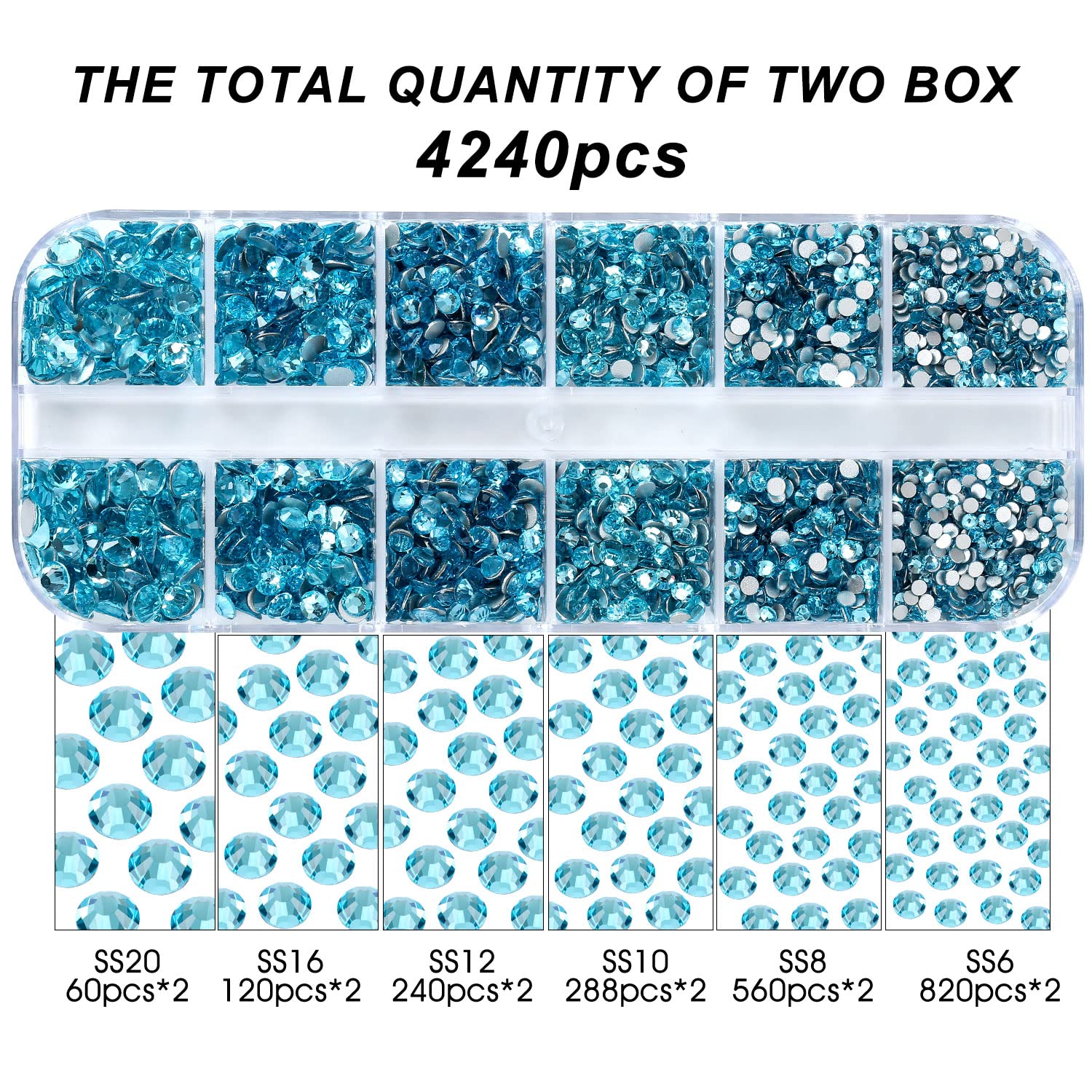 4240Pcs Aquamarine Flatback Rhinestones 6 Sizes Crystal Diamonds for Nail Art Crafts Clothes Shoes with Tweezers and Picking Pen