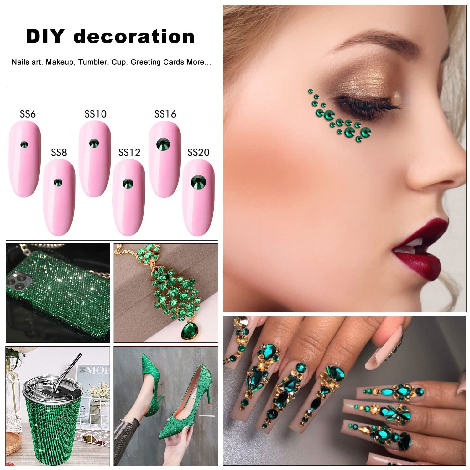 - 💎Uses: You can use rhinestones for nails, art, jewelry, skin, teeth, face, eyes, makeup, glasses, crafts, cardstock, cell phones, phone cases, plastic, glasses, etc.