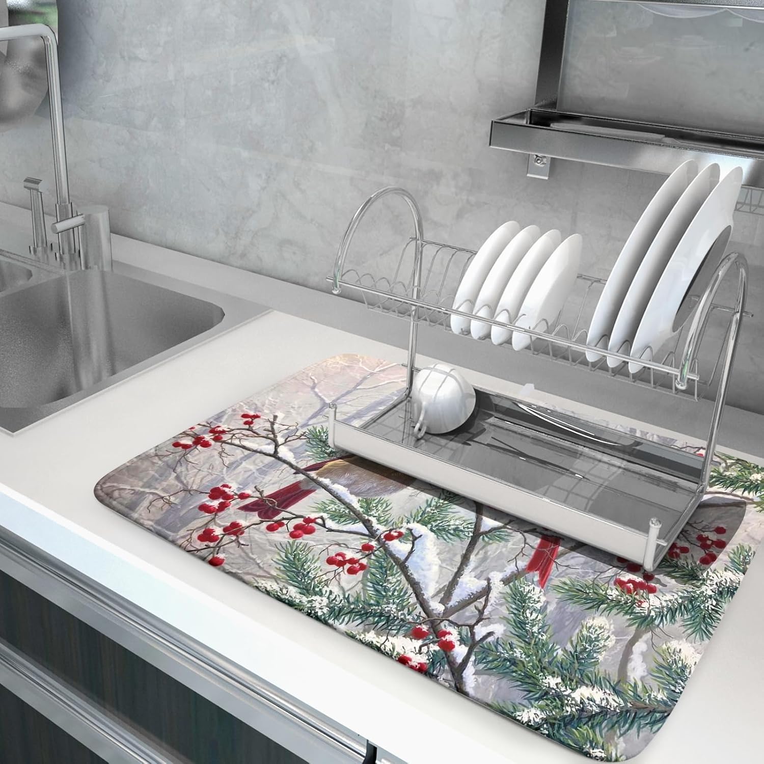 Red Bird Dish Drying Mat Merry Christmas Dishes Pad Absorbent Fast Dry Dish Drainer Mat Protector for Kitchen Counter 18 x 24 Inches