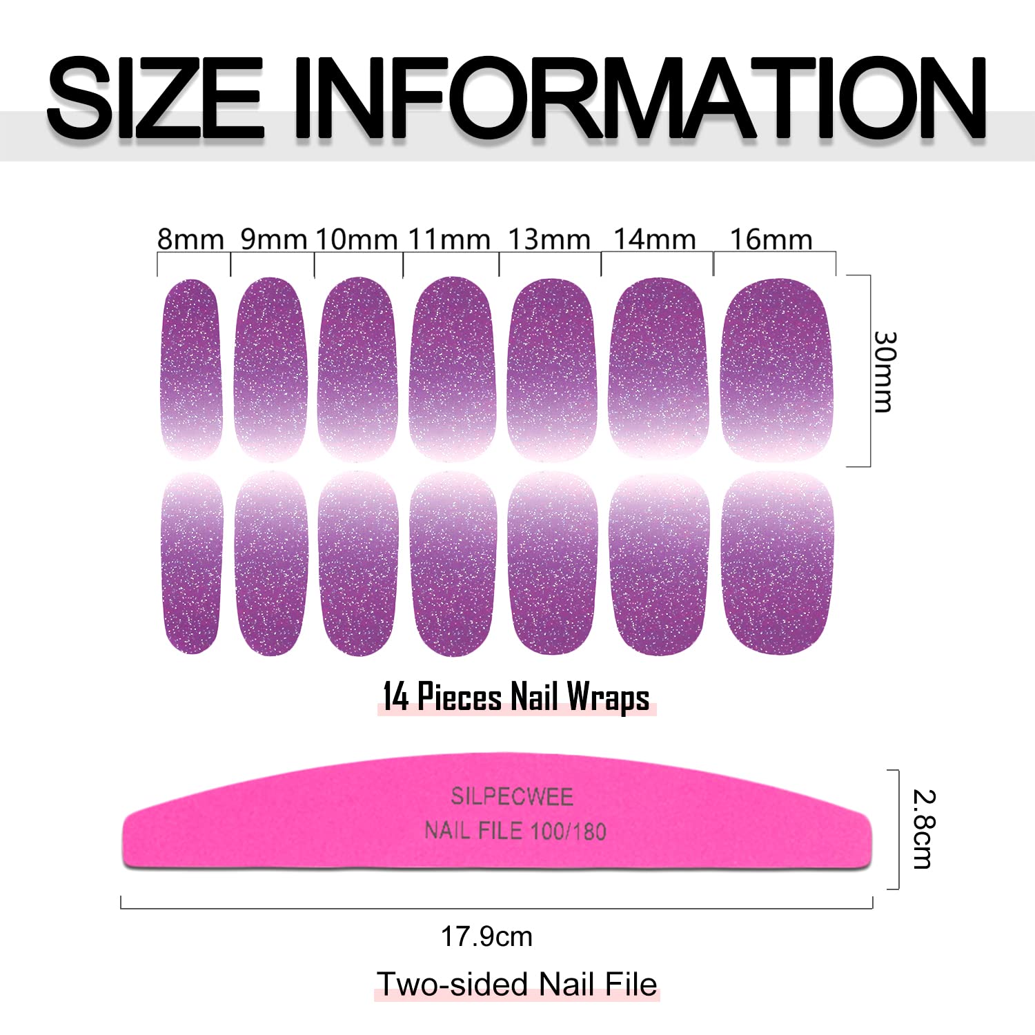 - Package Content - 16 sheets glitter nail polish strips for women + 1pc nail file. each sheet of measures approx. 10 x 5.5 cm/ 4 x 2.2 inches, total 224 pieces and 7 different sizes, convenient to carry and store without taking up much space.