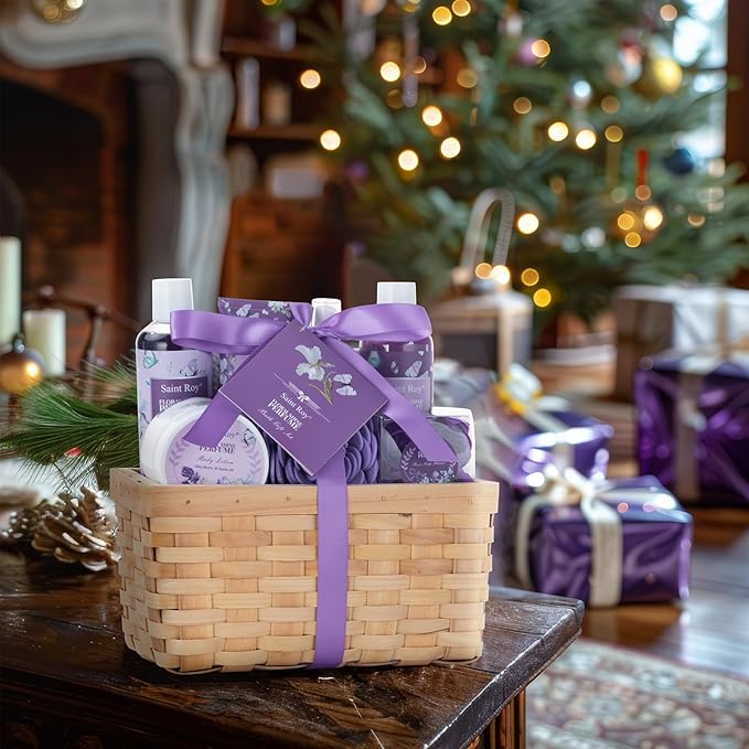 - Bath & body spa basket set. Contains a natural hand-made basket Can Be Used In Many Different Ways Such As Storing A Variety Of Items In A Bathroom Or Bedroom. Beautifully Wrapped & Packaged and Meet Everything You Need for a Good Home Spa experience. Its upscale and beautiful basket makes a multi-purpose storage solution to keep your beauty essentials.This holiday bath set for women gift is filled with beautiful surprises that will help you prepare for all of your holiday festivities, Perfect Gift Bath Gifts It also has a gift note card for you to personalize it