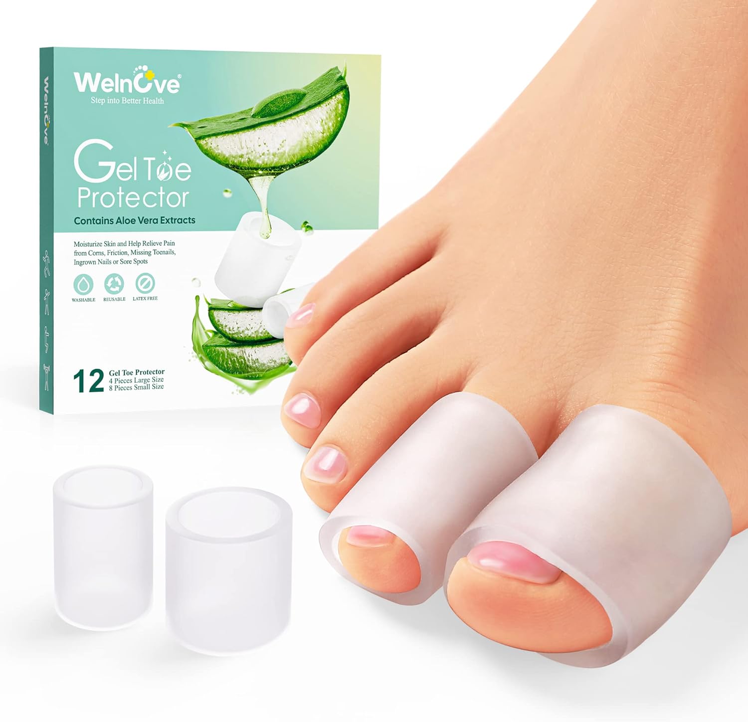 Welnove Toe Protectors – 12-Pack Aloe Vera Extract Infused Silicone Toe Sleeve Toe Covers for Hammer Toes, Corns, Calluses, Blisters – Soft Gel Protector Toe Cushions for Pain Relief (Multi-Size)