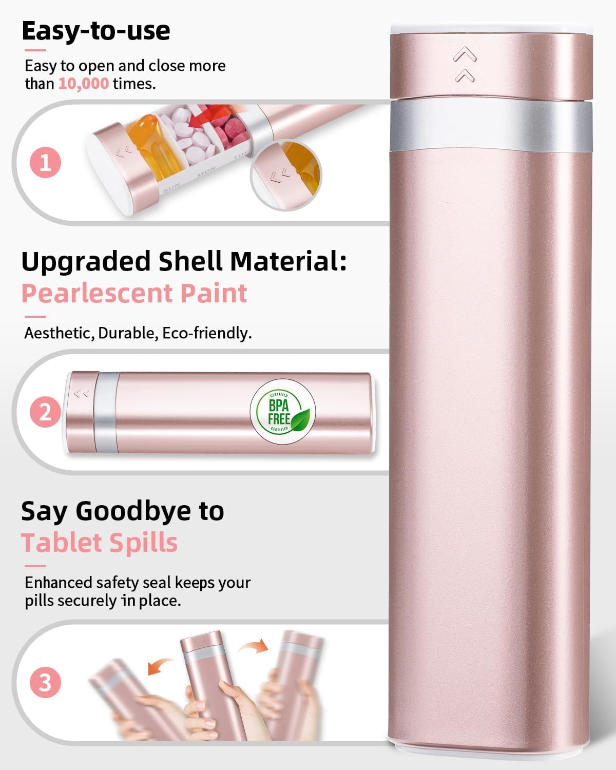 - Special Feature : BPA-Free - Upgraded with a pearlescent coating for maximum pill protection., Easy to Use - Ideal for those with limited grip strength or arthritis., Long-lasting - Outlasts 20% of similar products, with over 10,000 uses. Reliable for daily use., Ultra-Portable - Fits in your pocket, perfect for travel. BPA-Free - Upgraded with a pearlescent coating for maximum pill protection., Easy to Use - Ideal for those with limited grip strength or arthritis., Long-lasting - Out… See more