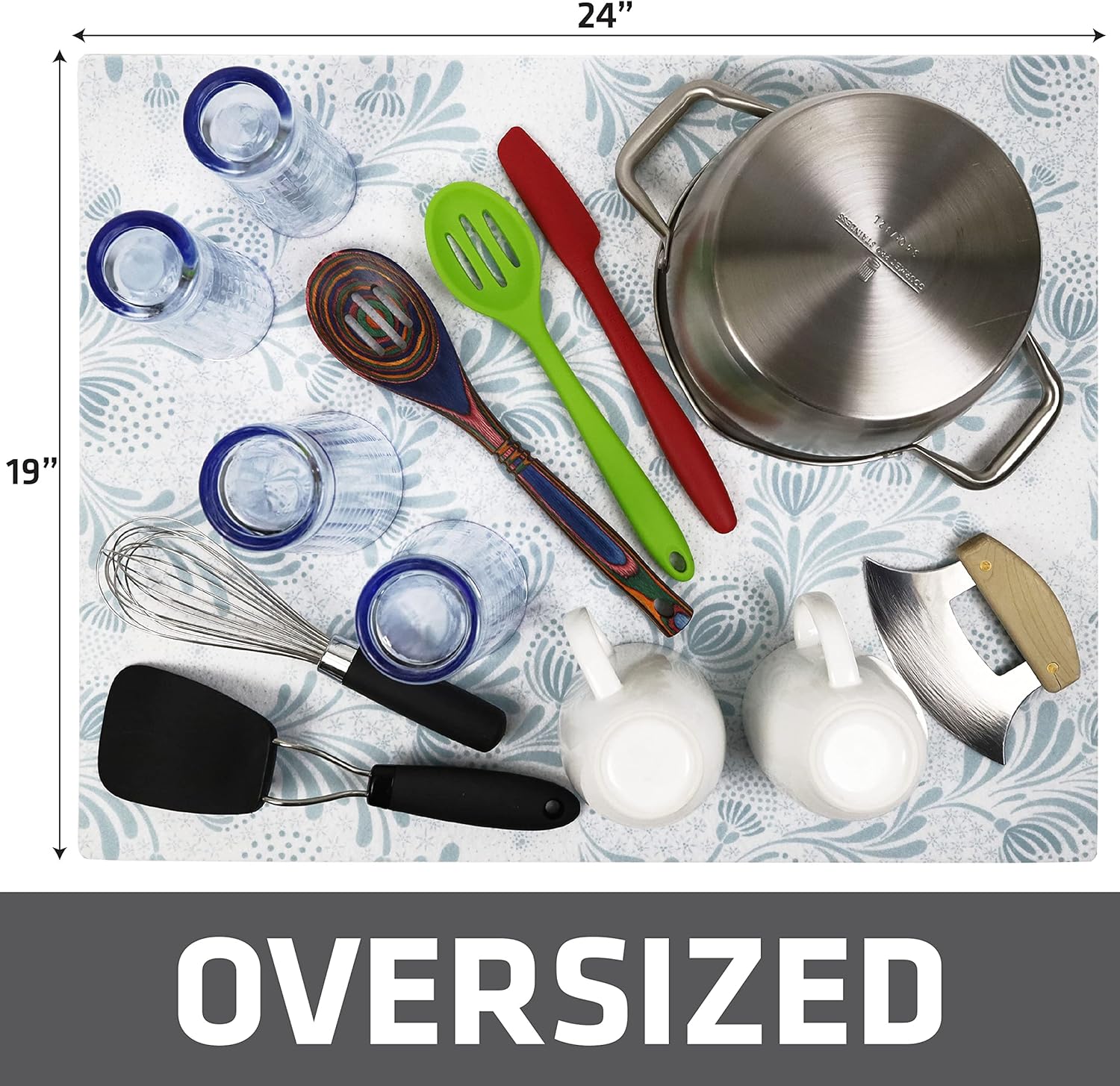 - (XL SIZE) KEEPS COUNTERTOPS CLEAN AND DRY (PREMIUM LOW-PROFILE DESIGN): The low-profile design (0.13” thick), adds stability when drying stemware or other delicate items and allows moisture to evaporate quickly. The XL size is great for air-drying dishes, glasses, silverware, pots, pans, and fruits and vegetables.