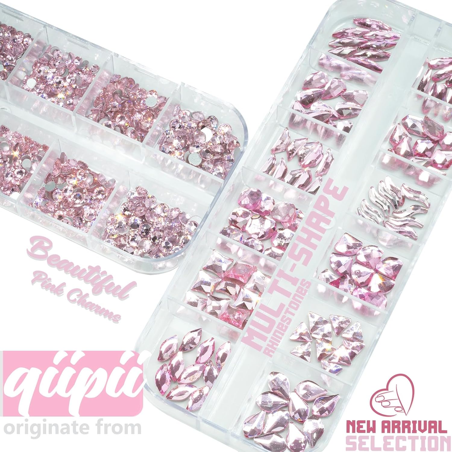 - ❤【2 Boxes 24 Grids Crystal Pink Nail Rhinestones + Stainless Steel Tweezer + Pickup Pen】Qiipii 3080Pcs sparkling Crystal Pink rhinestones nail crystals. Including 120pcs multi-shaped crystals rhinestones, 2130pcs multi-sized round crystal gem rhinestones. Enough amounts and more shape options for your daily work, go out or other decoration purposes. Comes with 1 Stainless Steel Tweezer and Pickup Pen for Manicure DIY Decoration at Home Salon Supplies.