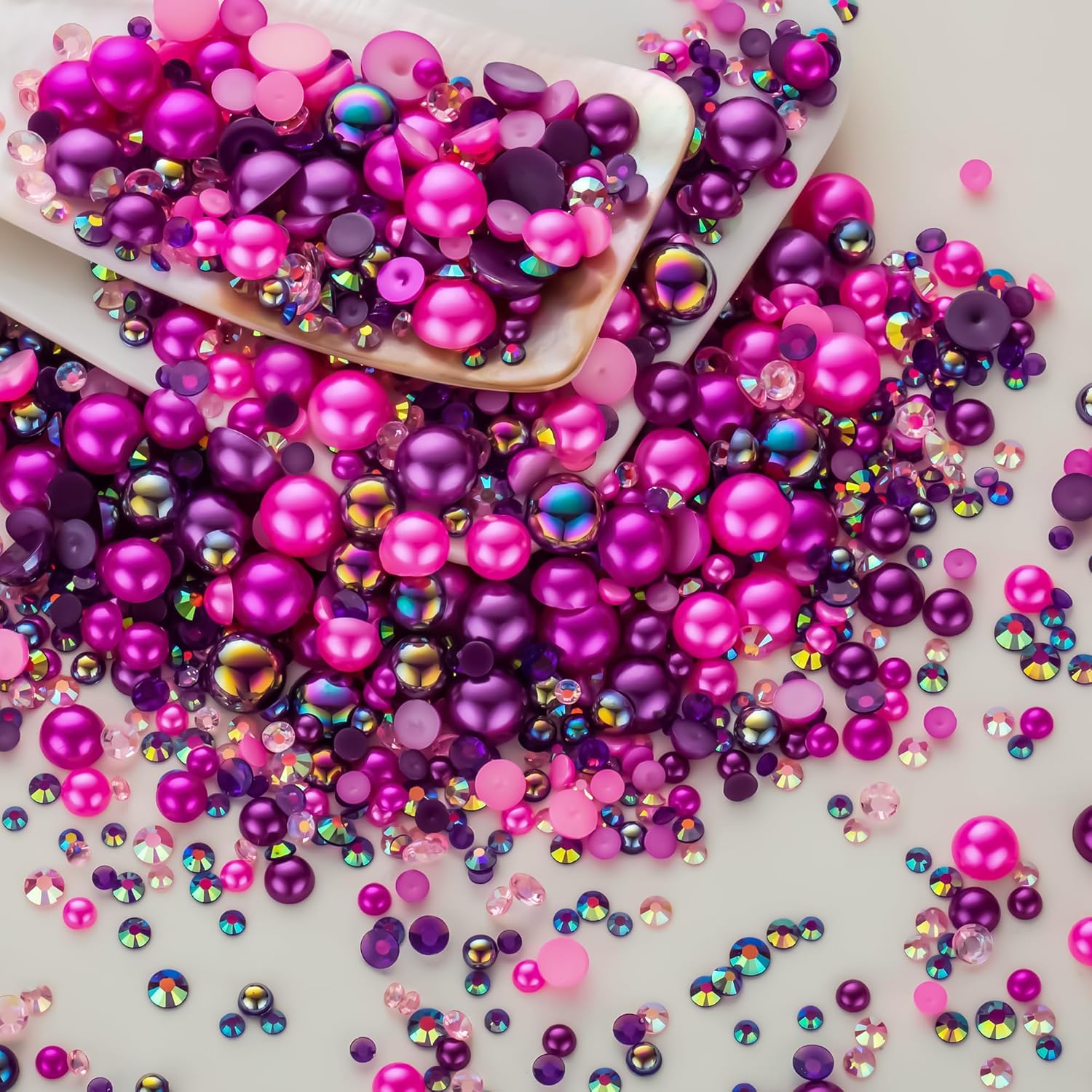 60g Pink Purple Flat Back Pearls Rhinestones for Crafts Mixed Size 3mm-10mm AB Color Round Half Pearls Flatback Pearl Beads and Resin Rhinestones Set for Face Art with Glue