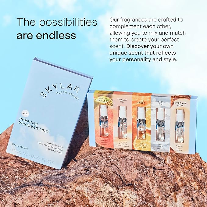- Special Feature : Nature-Inspired Scents: Discover our five womenÍs fragrances for every mood and every occasion. Whether youÍre feeling breezy, juicy, bright, or warm your dream is just a spritz away., Wear and Pair: Fragrances are designed to either be worn alone or layered together for a scent that is uniquely you., Responsible Fine Fragrance: We go above and beyond the strictest global regulatory standards to ensure your skin's safety. Our ingredient policy was developed with a toxicologist to intentionally omit harmful ingredients., A curated set of five crisp, clean, nature-inspired scents to transport you to your dream destination., Clean Perfume Gift Set: Hypoallergenic, vegan, cruelty free & safe for sensitive skin. Skylar's eau de parfum sample perfumes for women are free from parabens, phthalates, sulfates, synthetic dyes and thousands of harmful chemicals. Nature-Inspired Scents: Discover our five womenÍs fragrances for every mood and every occasion. Whether youÍre feeling breezy, juicy, bright, or warm your dream is just a spritz away., Wear and… See more