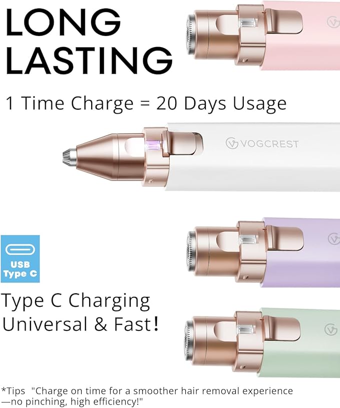 - 2 IN 1: VOGCREST facial hair remover and eyebrow trimmer for women is ingeniously designed to remove face and eyebrow hair, leaving you free from any worries about unwanted hair.