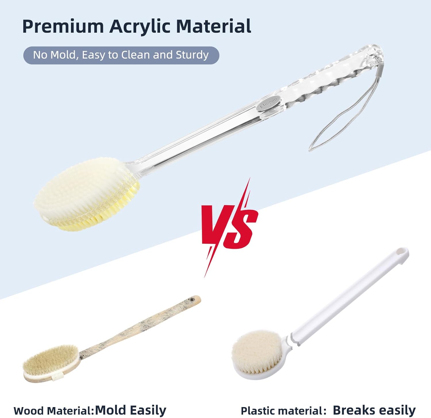 - 【Non-Mold & Sturdy】Wooden brushes mold easily,plastic brushes are easy to bend and break. Thus acrylic is used as the handle material,sturdy and never go moldy owing to features of acrylic: high toughness,high light transmittance and high weather resistance.