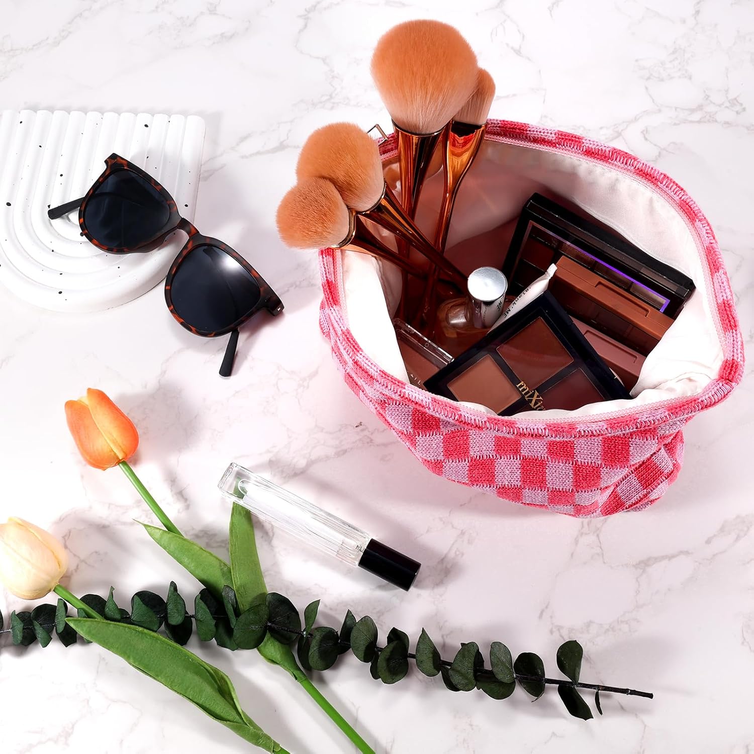 - LIGHT WEIGHT AND EXCELLENT WORKMANSHIP: The cute makeup pouch is made of soft knitted fabric and is comfortable, soft and lightweight. Checkered travel make up bag folds up when not in use and fits in a large bag without taking up space. The metal zipper of the cute pencil case keep your items secure and organized inside. Cosmetic bag accessories set for women