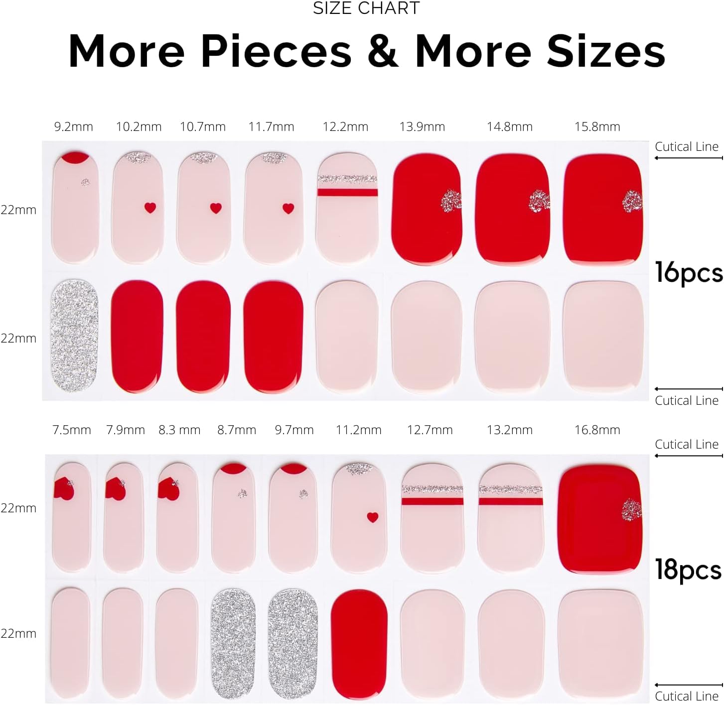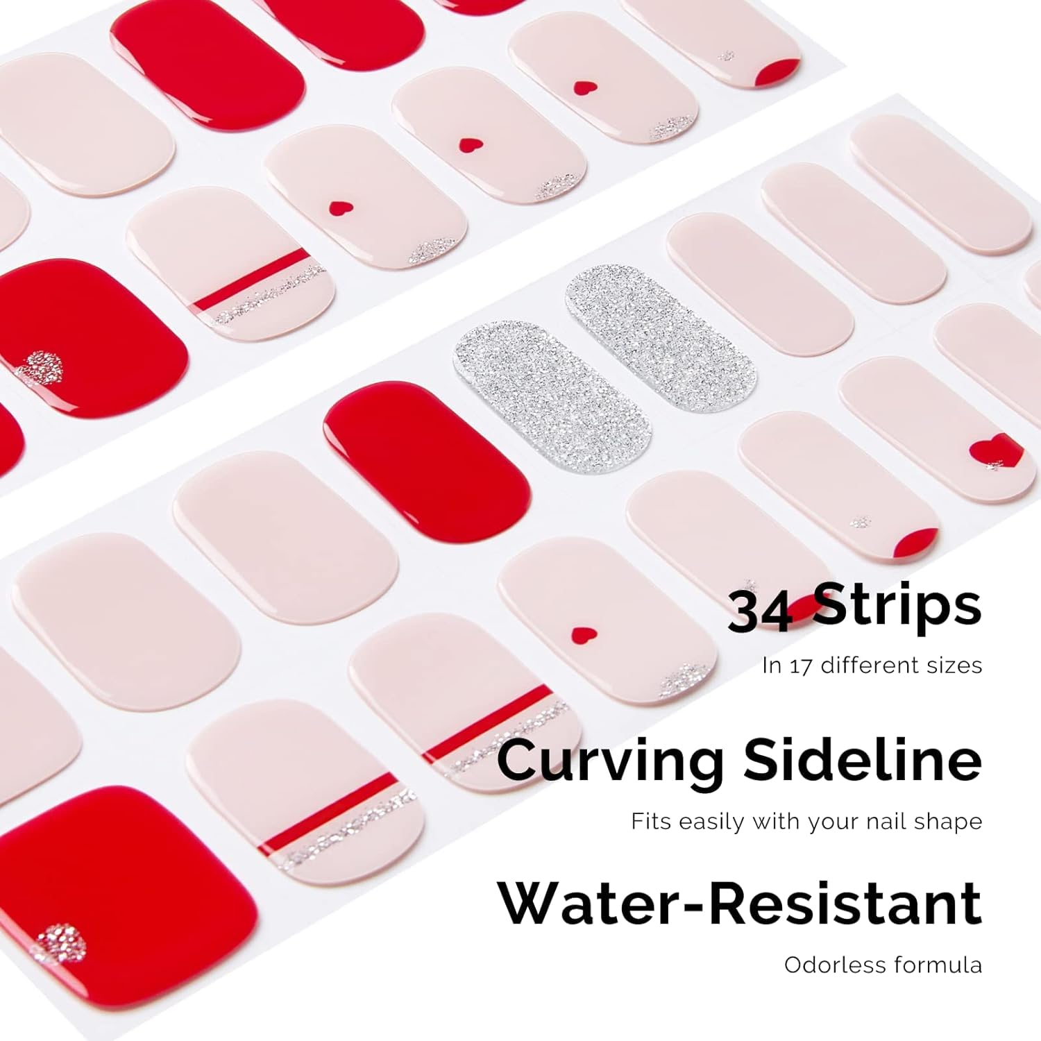 - 【Valentines day NAIL STRIPS】More Quantity & Sizes than Ever! - With 17 different sizes of our nail art stickers, you can easily find the right size to match your nails. - New curved side line fits even better with your nail shape for seamless adhesion.