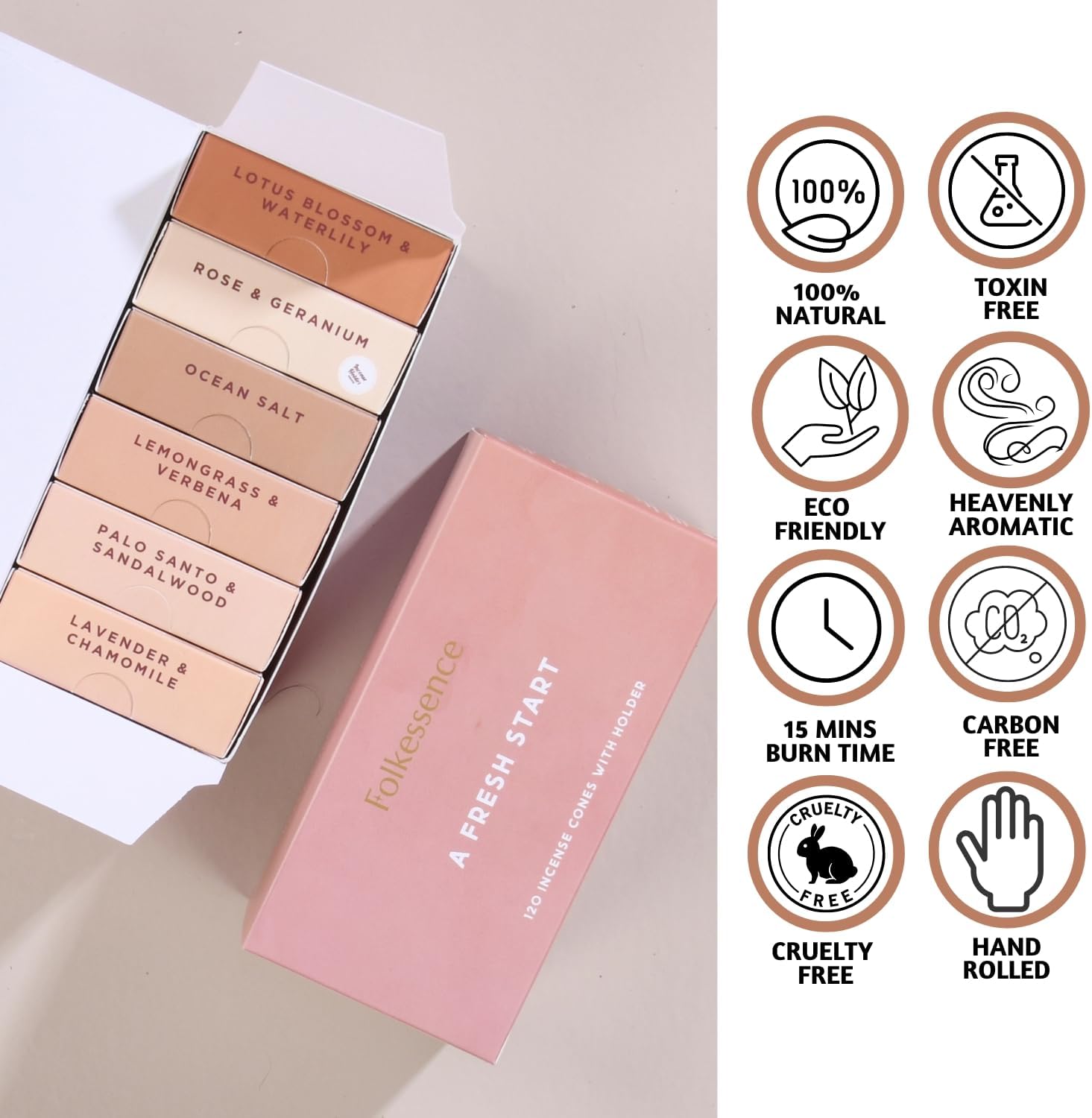 - [Variety Pack with Longetivity] - These bamboo free insenses come in 6 unique fragrances with 20 cones each and a ceramic incense holder. These 100% natural incense cones have a burn time of 10 minutes, ideal for a clean and calming environment.