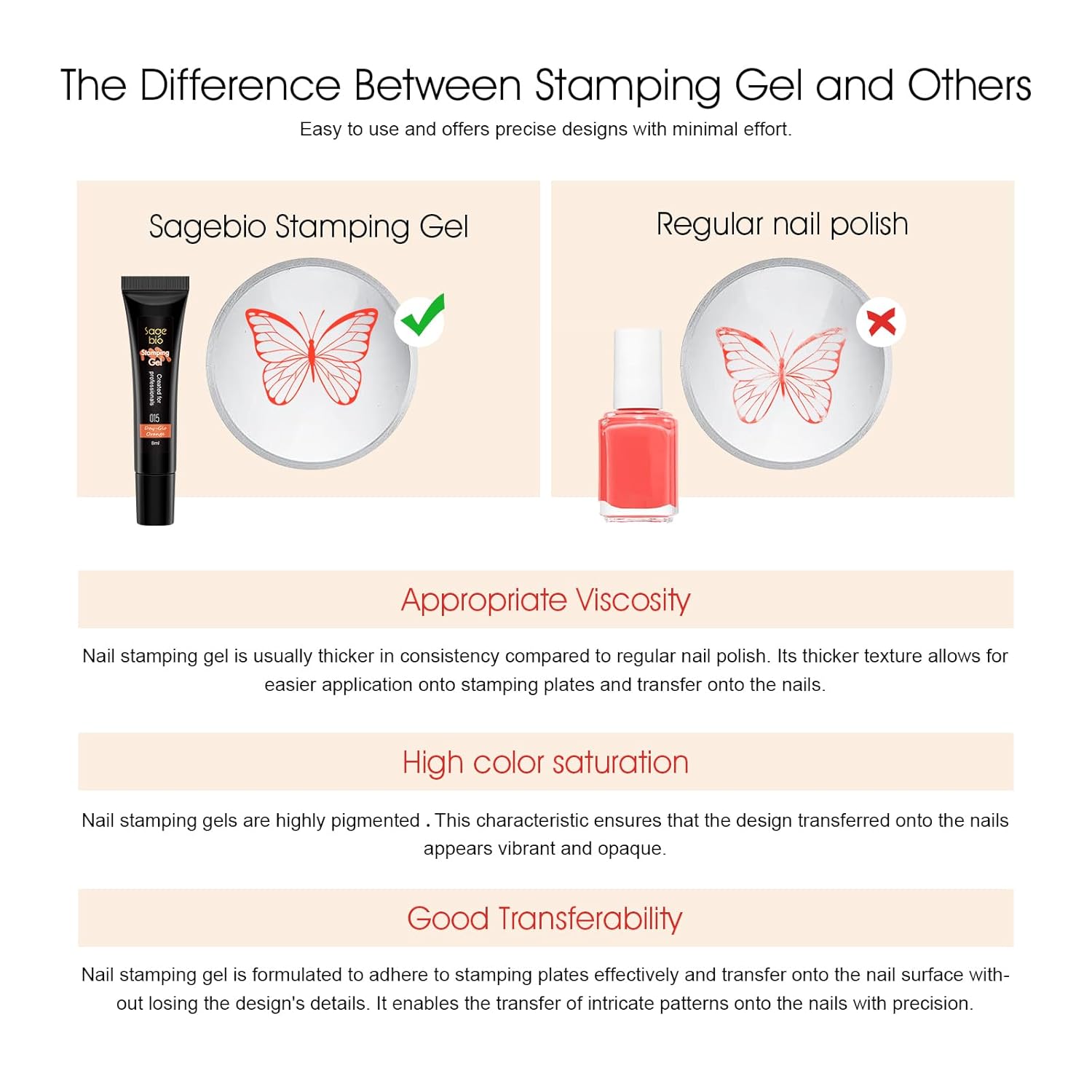- Included Components : 8 Colors of stamping polish gels, 5 stamp plates, 1 stamper with 2 heads, scraper