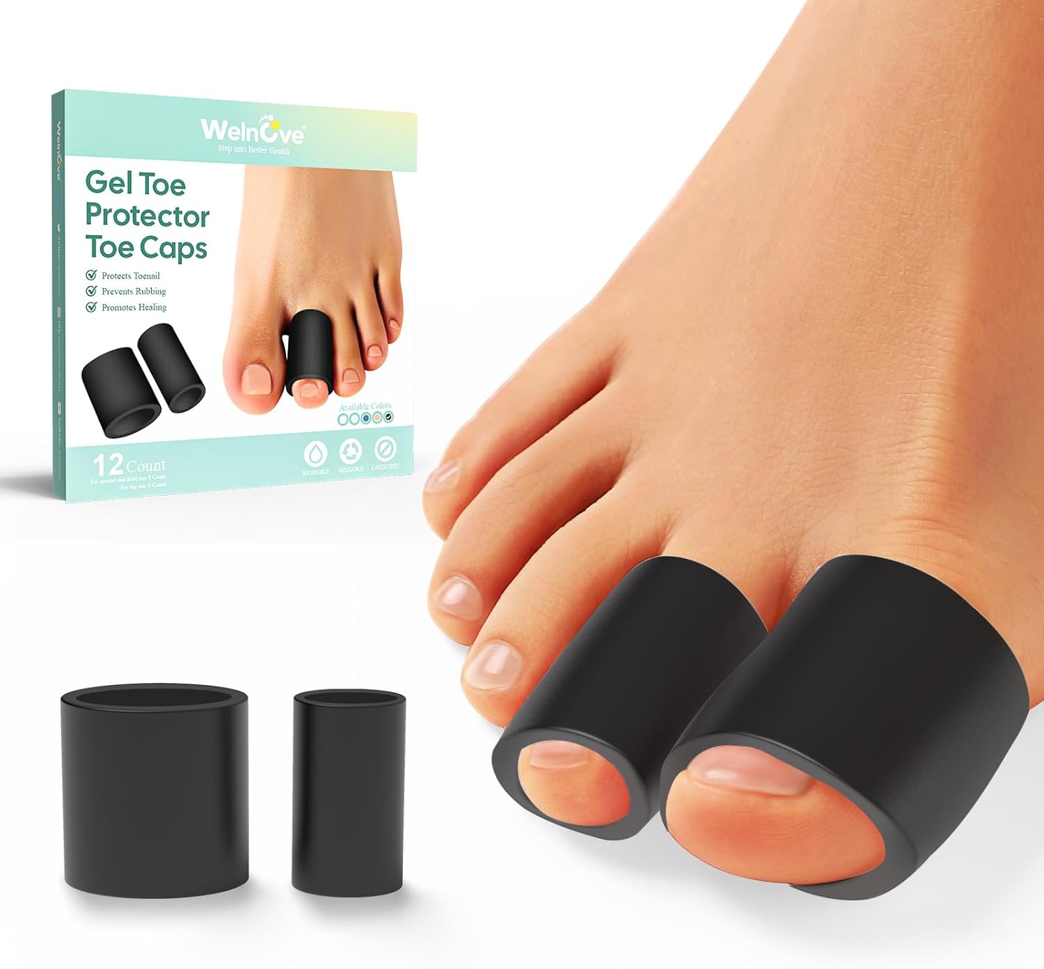 Welnove Toe Protectors – FSA/HSA Eligible 12-Pack Silicone Toe Sleeve Toe Covers for Hammer Toes, Corns, Calluses, Blisters – Soft Gel Protector Toe Cushions for Pain Relief (Multi-Size)