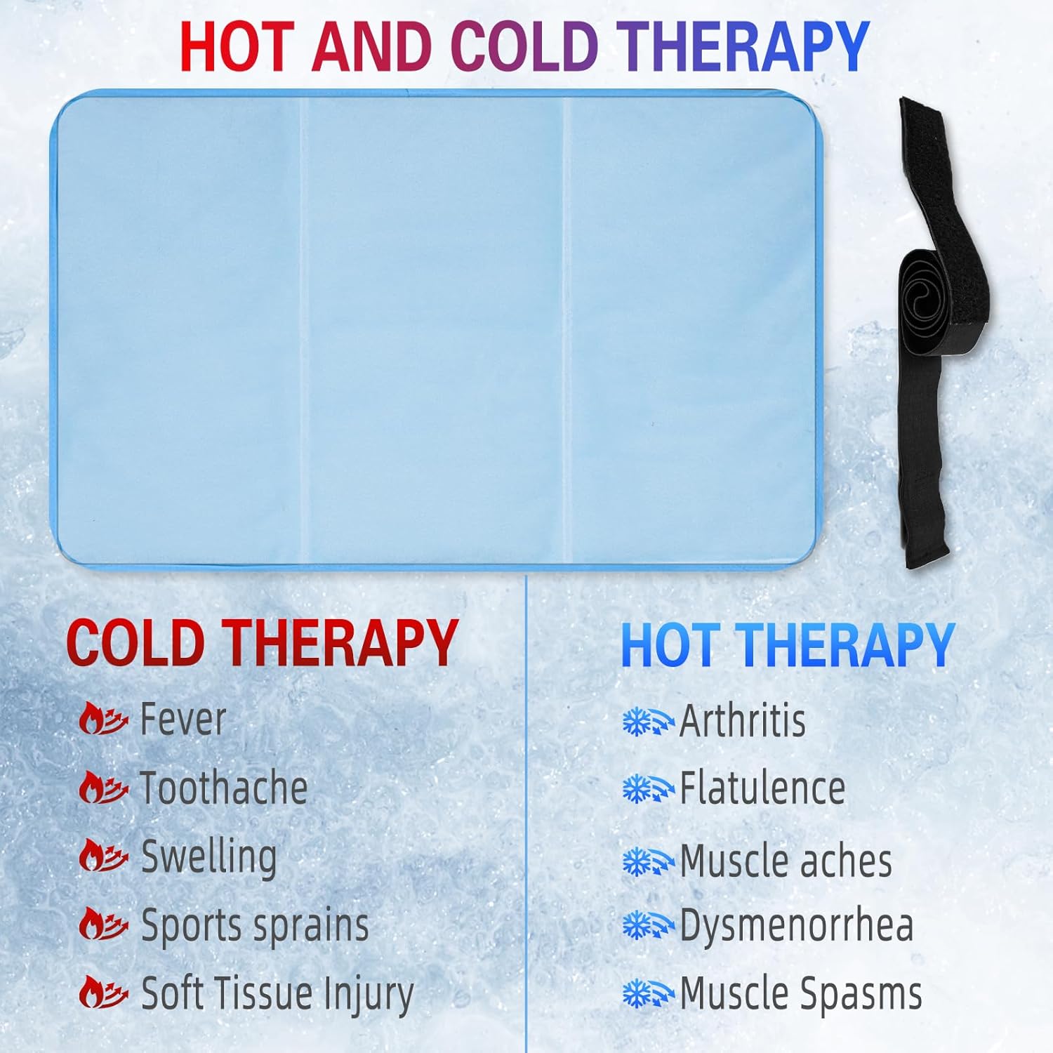 - HOT AND COLD THERAPY: Our ice pack for back offers dual functionality. Heat therapy can help alleviate abdominal pain, joint stiffness, and promote blood circulation. Cold therapy is ideal for relieving muscle soreness and aiding in post-operative recovery.