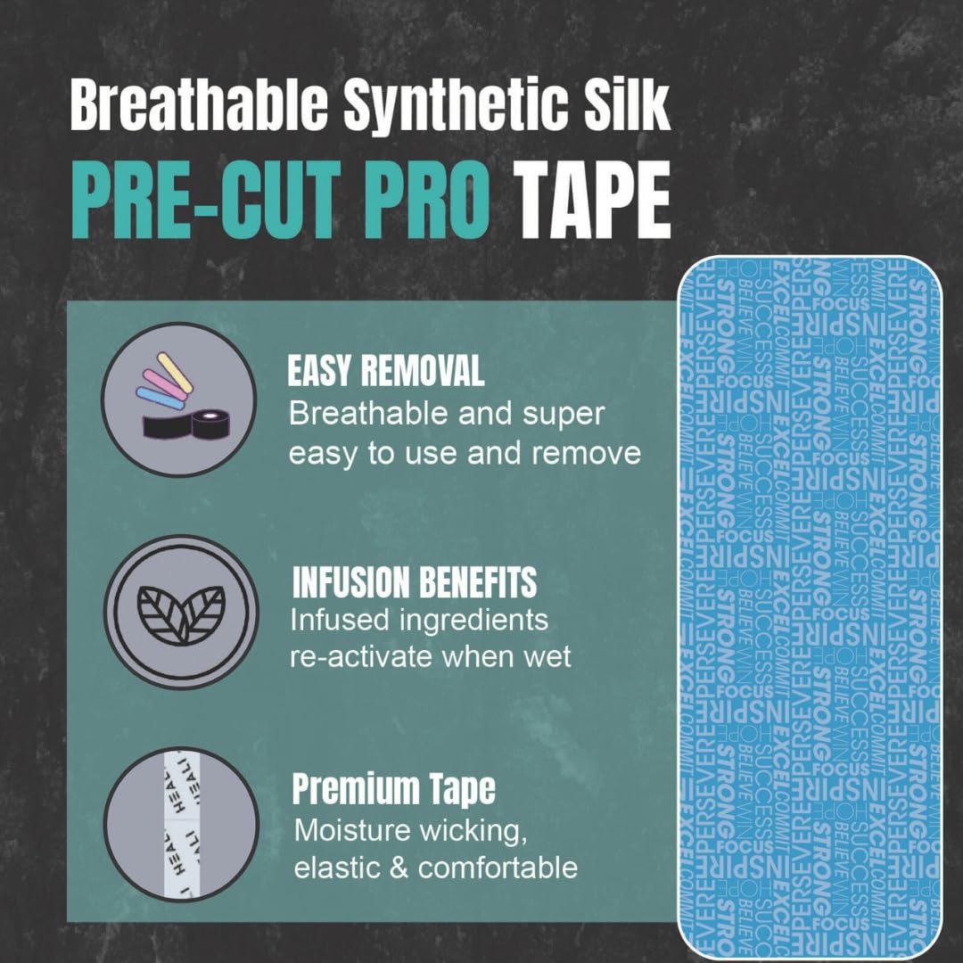 - PRODUCT DETAILS AND PERFORMANCE: 20 precut strips per roll of pro kinesiology tape. Strip Size (Width x Length) - 5cm x 25cm 2" x 10"; Product Type: Precut. Heali PRO Kinesiology Tape is infused with Magnesium and Menthol directly on the tape to support daily movement and active performance. Heali PRO Tape is made with soft and breathable synthetic silk and is latex free. The strong (sticky) adhesive lasts for 4-7 days.