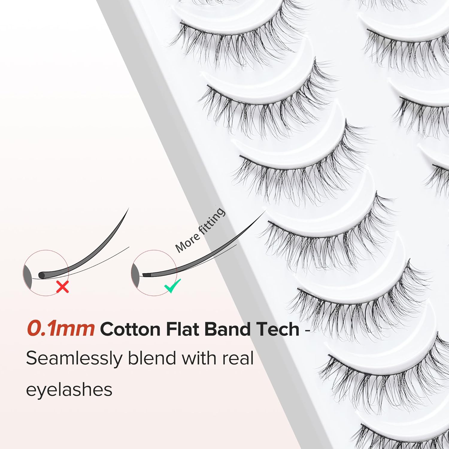 - THIN BAND FALSE EYELASHES: The wispy eyelashes use 0.1mm thin cotton flat band tech, seamlessly blend to your real eye lashes for a natural make up look, suit for DAY-TO-DAY use