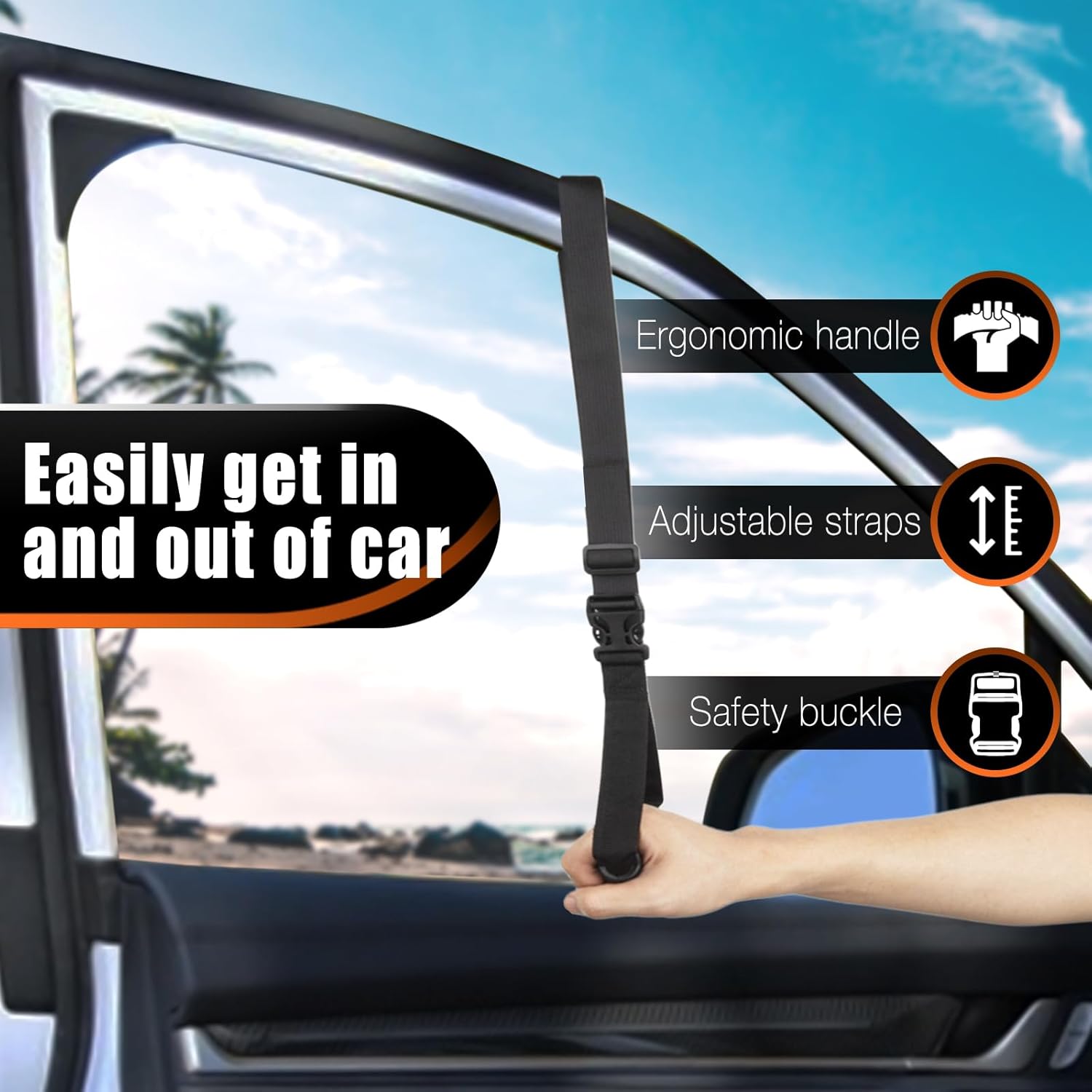 - 【Multifunctional design】 Universal most car, Automotive door assist handles not only could help people getting in and out of the car, but also could cutting the seatbelt and breaking the window in an emergency. The strap can be easily placed around the contour of the window and then buckled. Height adjustable strap.