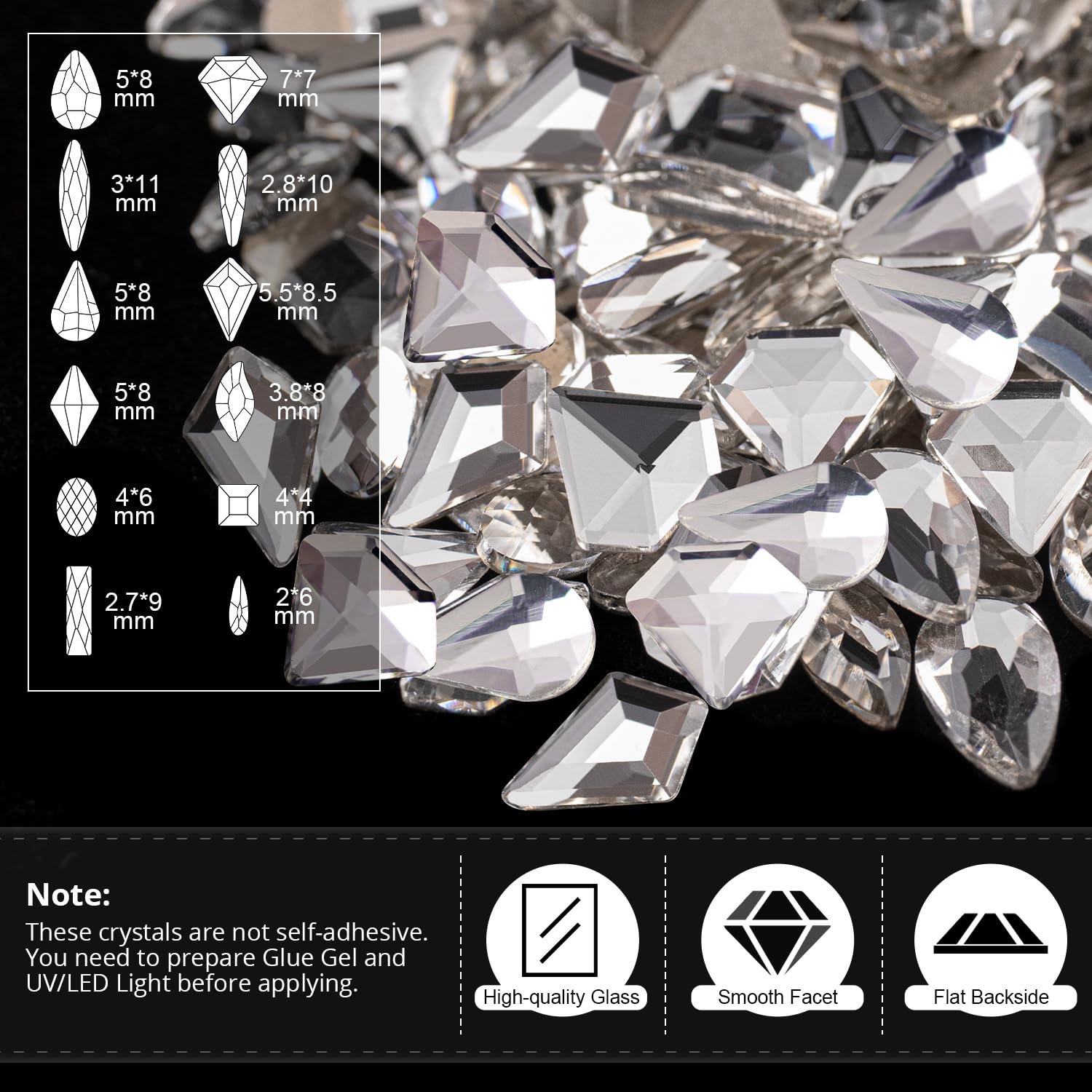 - 💎PREMIUM GLASS & MULTIPLE SHAPES: The luxurious and versatile diamonds in clear color that can be suitable for various occasions are made of durable, high-quality glass - superior to resin and acrylic. And 1 box of multishaped clear color diamonds is contained, such as horse eye, oval, rectangle, water drop, and rhomb rhinestones. All the nail crystals are featured with exquisite shapes and cutting facets.