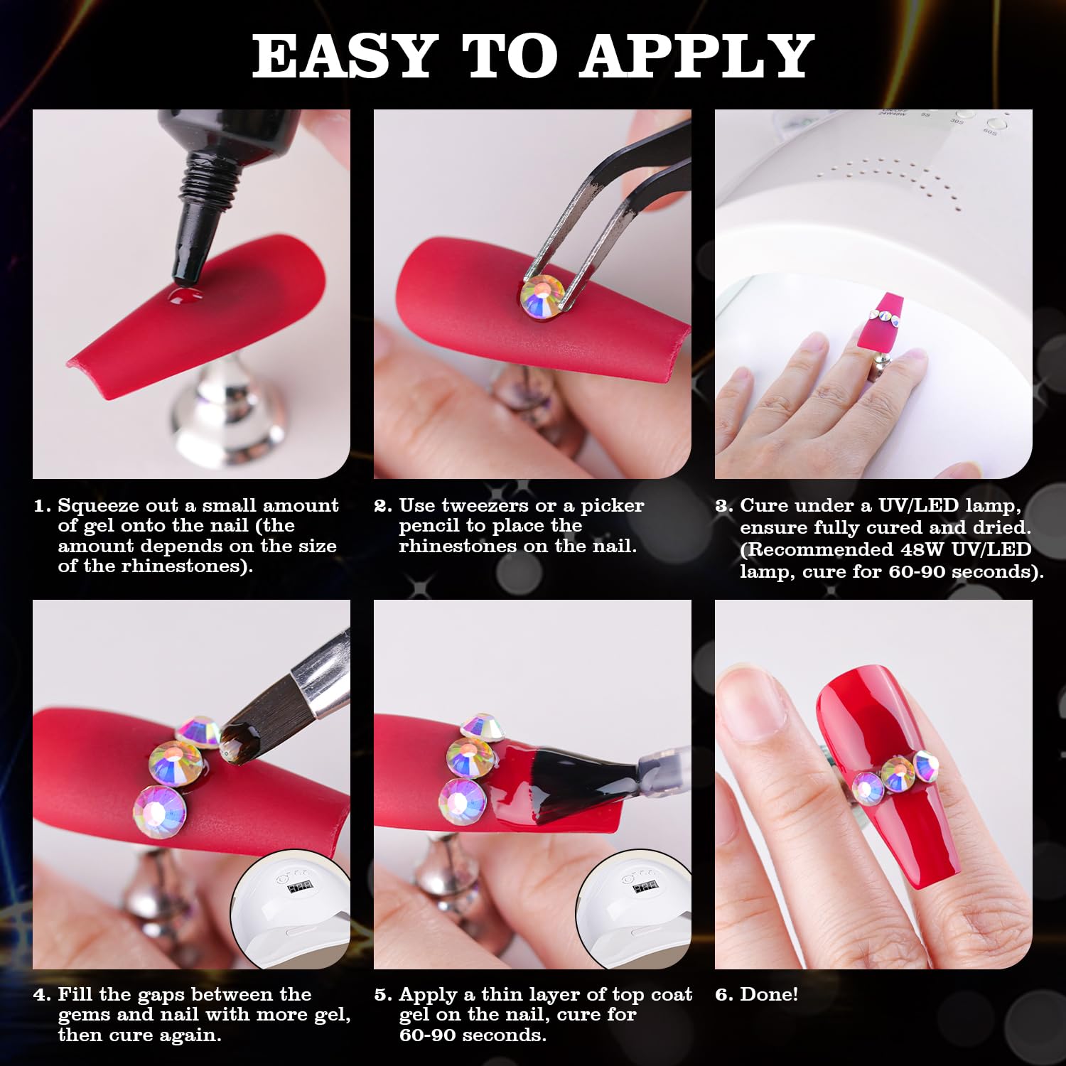 - 💎ADHESIVE GEL GLUE: The crystal clear nail gem glue uses a special, non-toxic and eco-friendly formula with strong tackiness, adhesion, and fluidity for easily applying decorations. It is a type of UV gel glue. After proper curing under a UV/LED lamp, the glue dries clear with superior bonding strength that can last weeks without falling off. With the designed tip, you can easily and conveniently apply the glue to the nail bed or the surface of false nails.