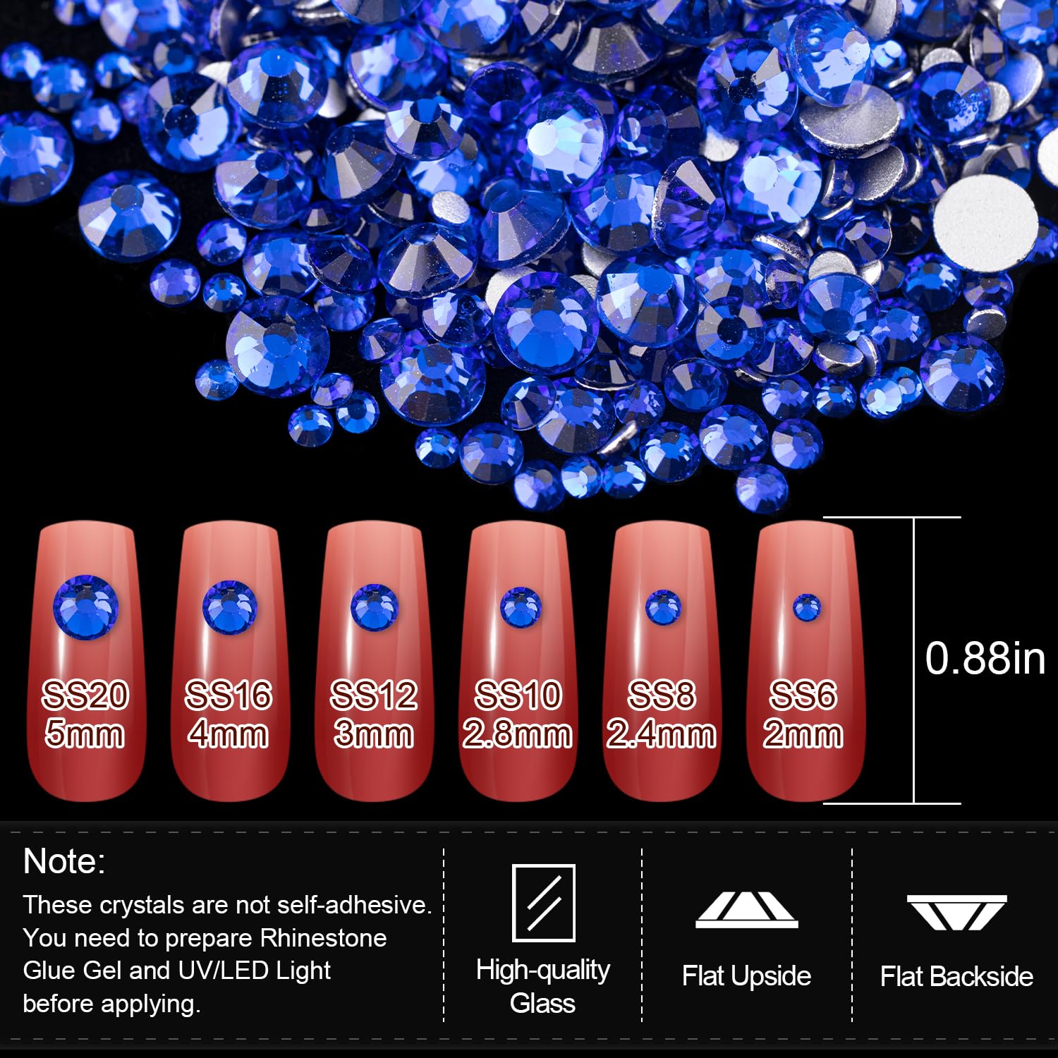 - 💎NAIL ART KIT: You will receive one box of round flatback glass nail charms in dark blue color (2/2.4/2.8/3/4/5mm) and one box of multishaped flatback glass nail charms in dark blue color. The functional tool kit for nail design is attached as well, which carries 1pcs 15ml rhinestone glue gel, 1pcs dual-end brush & dotting pen, 1pcs pickup pencil, and 1pcs tweezer.