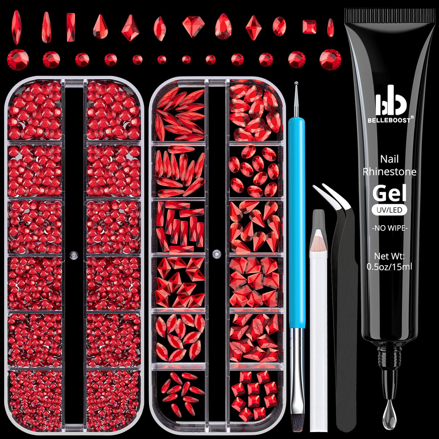 Rhinestones for Nails, Manicure Kit with Nail Rhinestone Glue Gel, Multi Shapes Red Glass 3D Nail Charms + Flatback 2-5mm Round Beads & Gem Glue for Nails (UV/LED Needed) with Pickup & Dotting Tools
