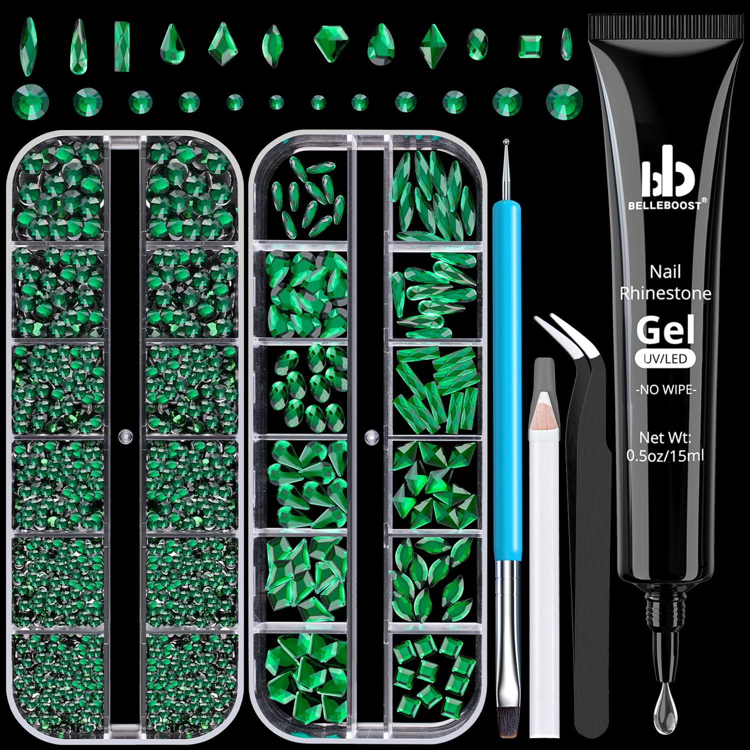 Rhinestones for Nails, Manicure Kit with Nail Rhinestone Glue Gel, Multi Shapes Dark Green Glass 3D Nail Charms + Flatback 2-5mm Round Beads & Gem Glue for Nails (UV/LED Needed) with Dotting Tools