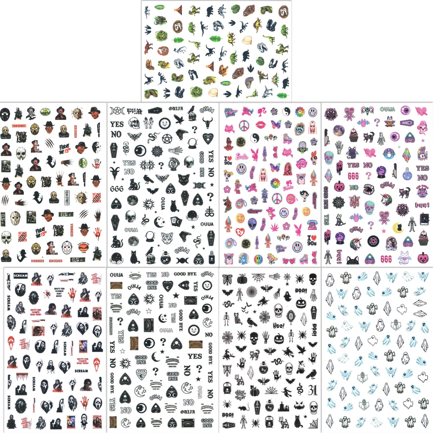 - Halloween Designs: Featuring scary film characters, ghost faces, skull patterns, vampire themes, and spider webs, these nail art stickers are specifically designed for Halloween. Get ready to stand out with these unique and spooky nail decorations.