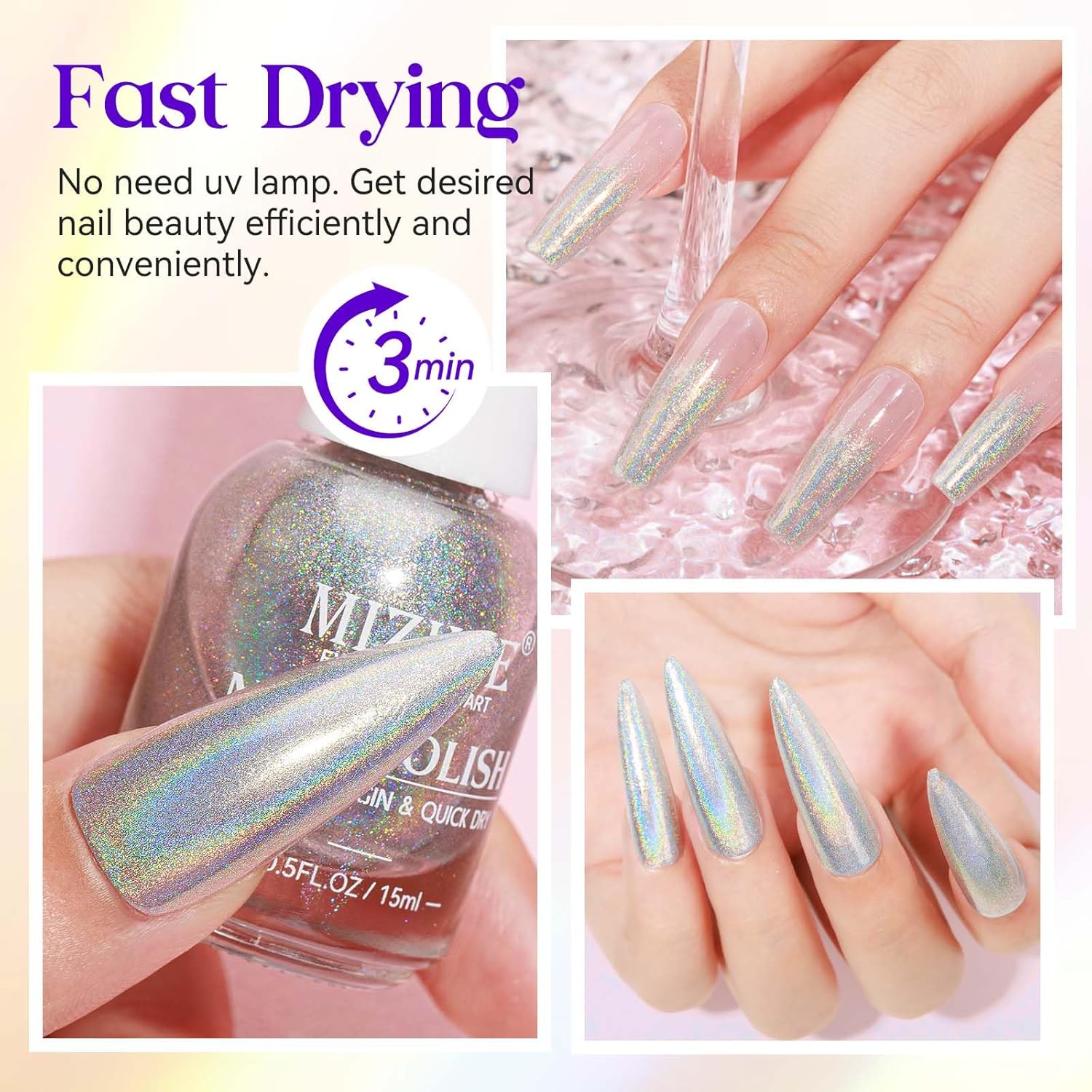 - MIZHSE Holographic Nail Polish: 1 x 15 ml (0.5 fl oz) holographic nail polish. The nail polish is high pigmented that makes the nails shine like rainbow. Can get different holographic rainbow effects based on different lights and viewing angles. Professional nail polish for infinite styles. Iridescent nail polish is suitable for use with any color nail polish you like as base color.