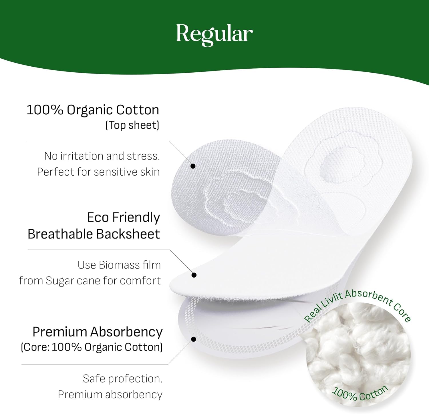 Livlit Regular Size Ultra Thin Sanitary Pads, 100% Organic Cotton from Texas, Powerful Leak Protection, Unscented, Chlorine Free and Absorbency of Feminine Periods, Pads for Women (14 Count)