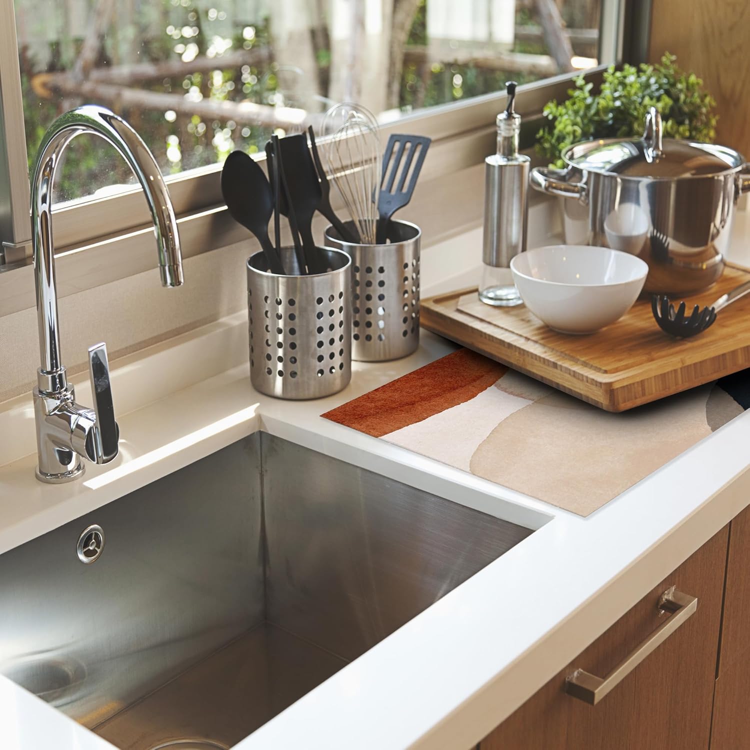 - MULTI-FUNCTIONAL: You can let it catches drips under a dish drying rack to keep the counter dry and clean, or you can place bottles, pots, pans, plates, bowls, cups, knives, silverware, serve ware, glassware, stemware, tableware and so on directly on the mat.