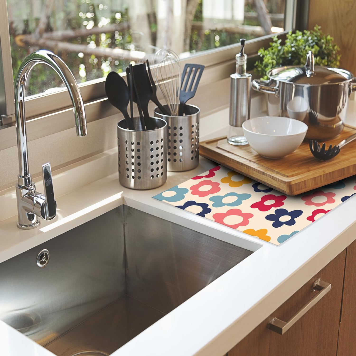 - MULTI-FUNCTIONAL: You can let it catches drips under a dish drying rack to keep the counter dry and clean, or you can place bottles, pots, pans, plates, bowls, cups, knives, silverware, serve ware, glassware, stemware, tableware and so on directly on the mat.