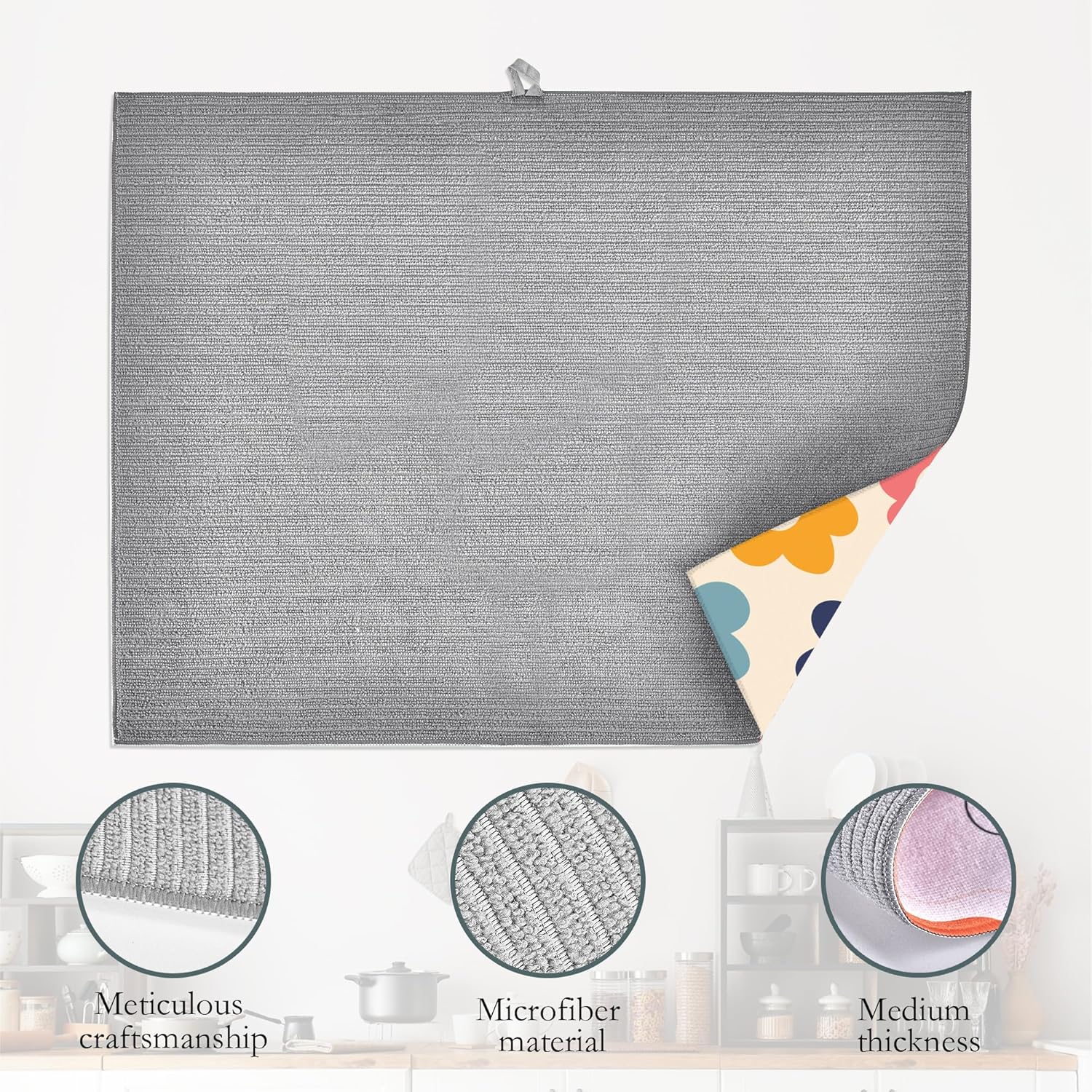 - DESIGN: Reversible with a different design on each side.The dish drying mat with hanging loop, can be hung on the kitchen wall. Soft and foldable, easy to store in any drawer, cabinet, or closet. Microfiber is naturally, long lasting, and cleans up easily, and is effortless to clean.
